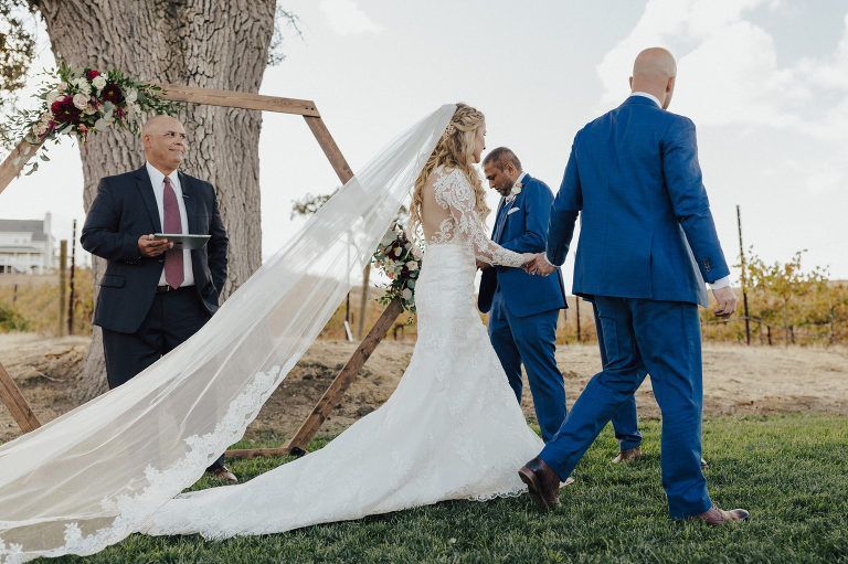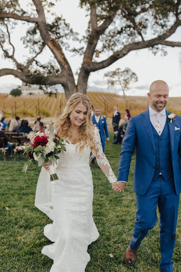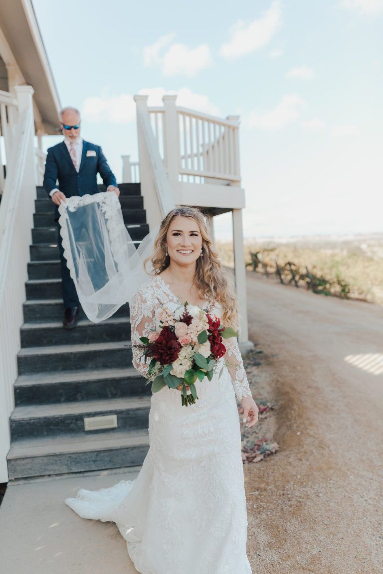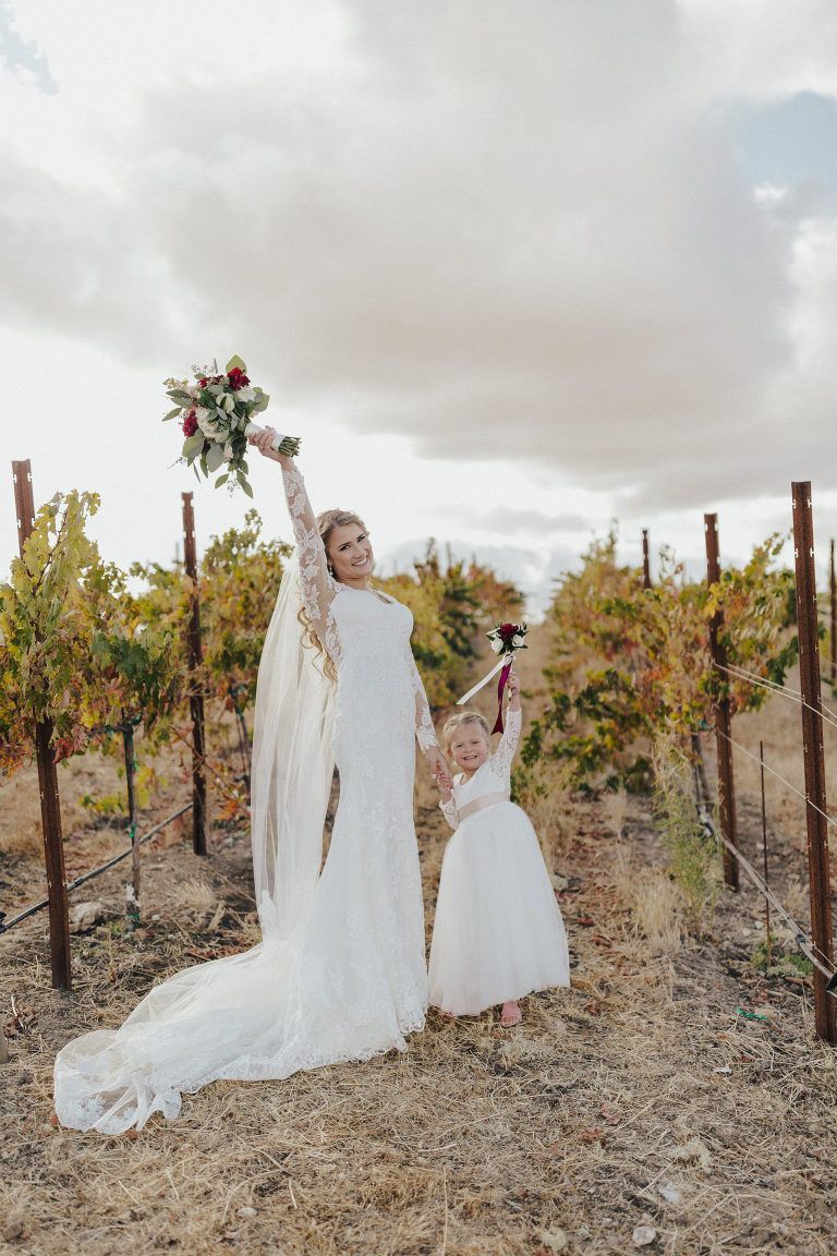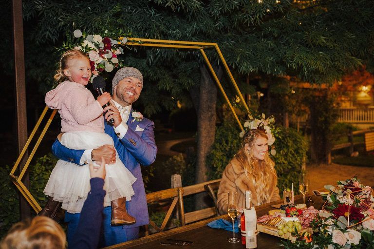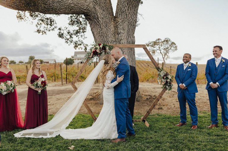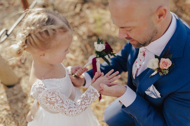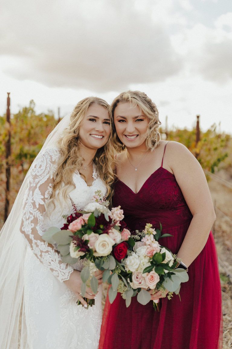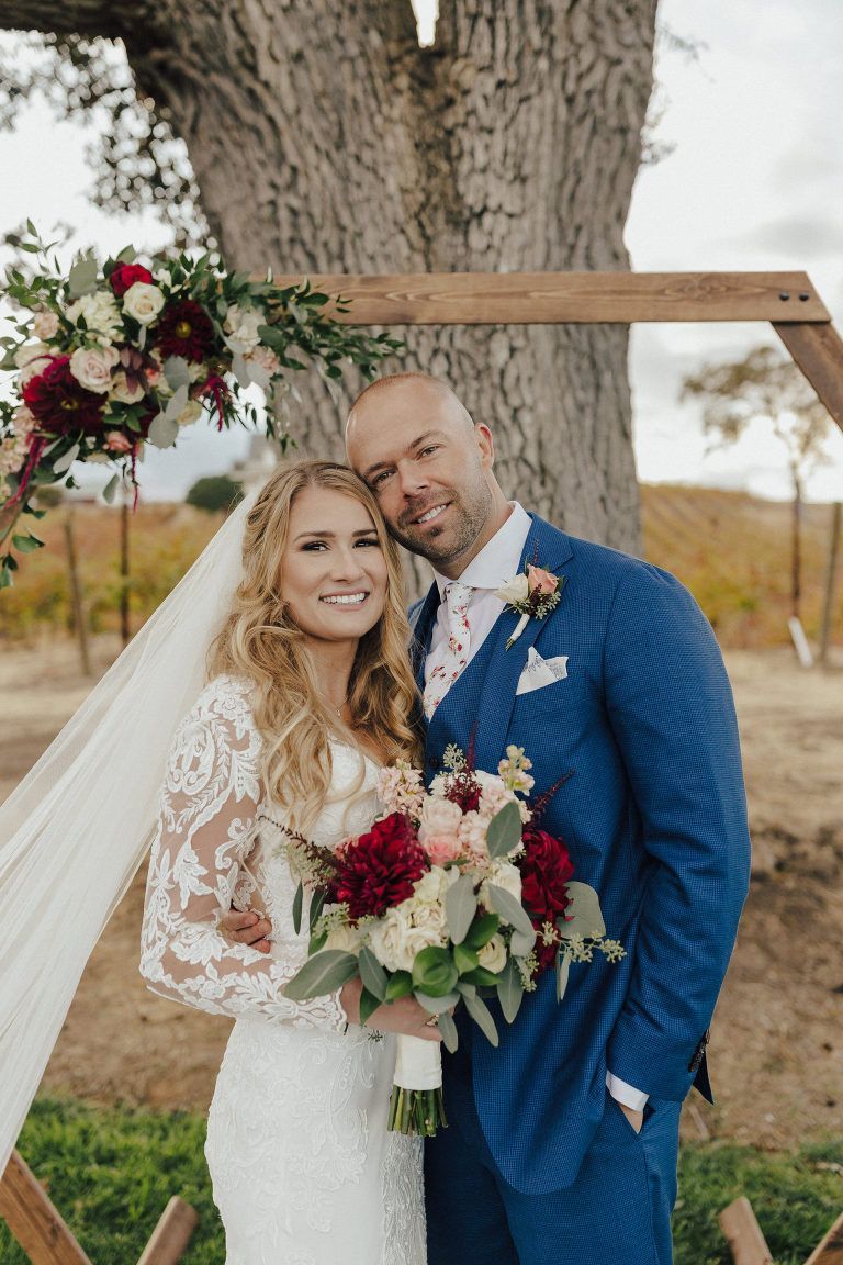 Aaron and Katelyn’s family-filled November nuptials were nothing short of incredible! Their wedding featured a ruby red and navy blue color scheme with a mix of classic and rustic elements. Their ceremony took place under the oak tree, in front of a rustic wooden hexagon arch and included a special family ritual. Katelyn’s bridal look was made complete with a long sleeve lace gown from Something Bridal Boutique , floor length veil, and faux fur coat. Her hair and make-up by The Blushed Company completed the look by styling her long blonde hair with loose curls and pinned it half up with wispy braids. Her flower girl’s dress matched perfectly, who was also in a long sleeve lace gown which was cinched with a cream satin bow and paired with her braided hair. Their special day was filled with sweet, tender moments captured by Lindsey Gomes Photography and Fig Leaf Video .
