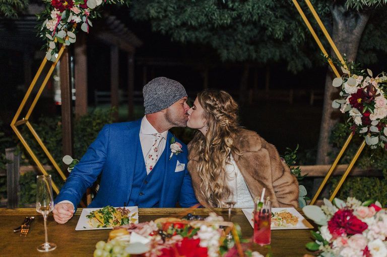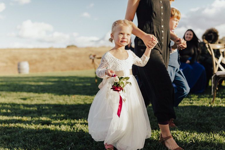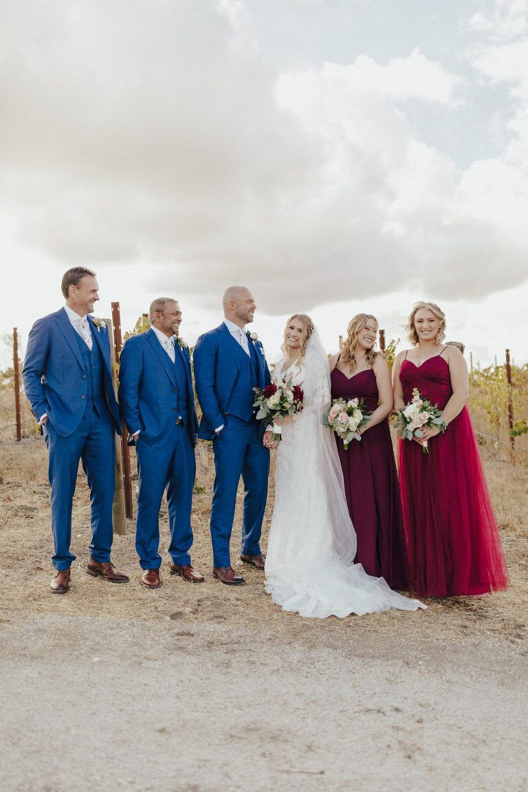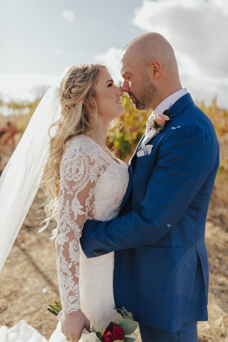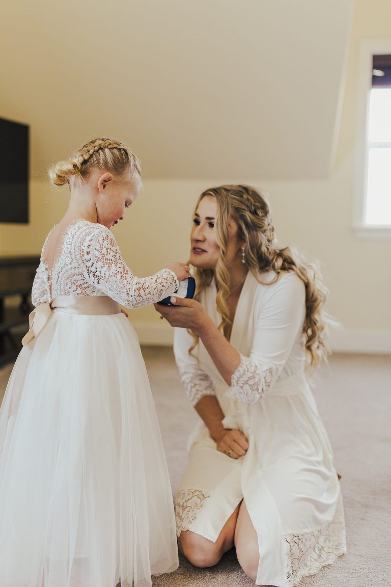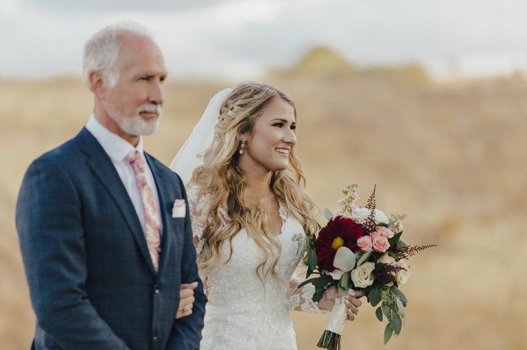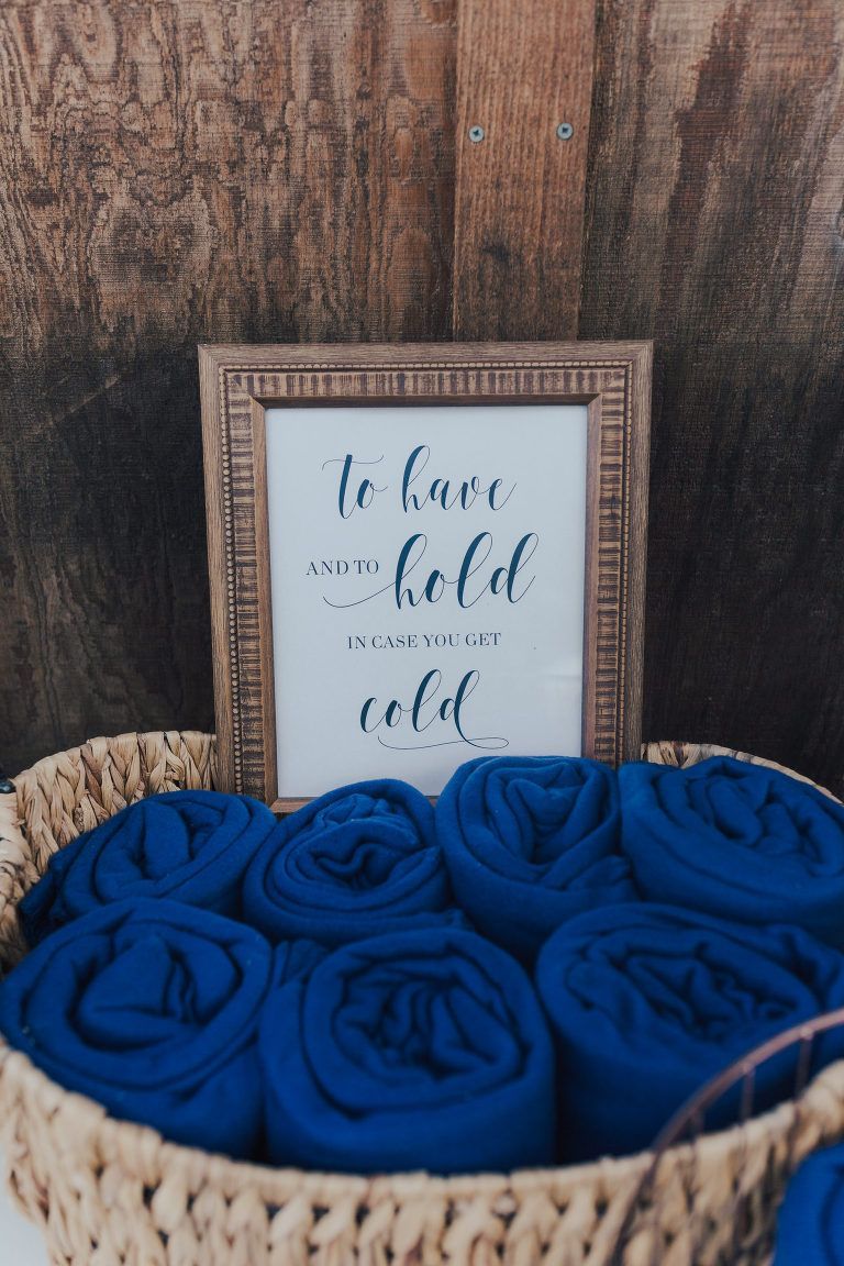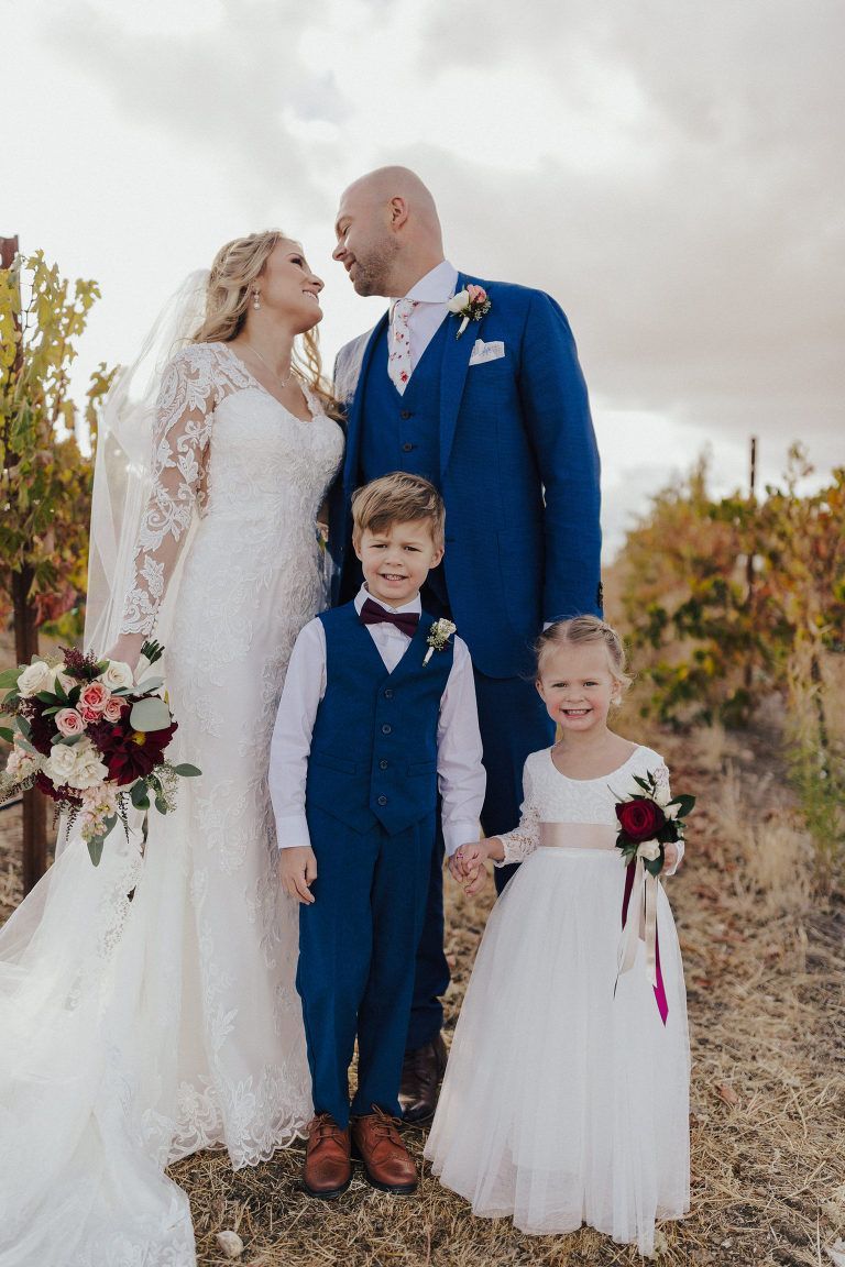 Aaron and Katelyn’s family-filled November nuptials were nothing short of incredible! Their wedding featured a ruby red and navy blue color scheme with a mix of classic and rustic elements. Their ceremony took place under the oak tree, in front of a rustic wooden hexagon arch and included a special family ritual. Katelyn’s bridal look was made complete with a long sleeve lace gown from Something Bridal Boutique , floor length veil, and faux fur coat. Her hair and make-up by The Blushed Company completed the look by styling her long blonde hair with loose curls and pinned it half up with wispy braids. Her flower girl’s dress matched perfectly, who was also in a long sleeve lace gown which was cinched with a cream satin bow and paired with her braided hair. Their special day was filled with sweet, tender moments captured by Lindsey Gomes Photography and Fig Leaf Video .