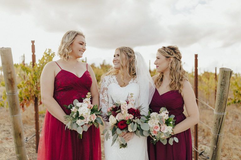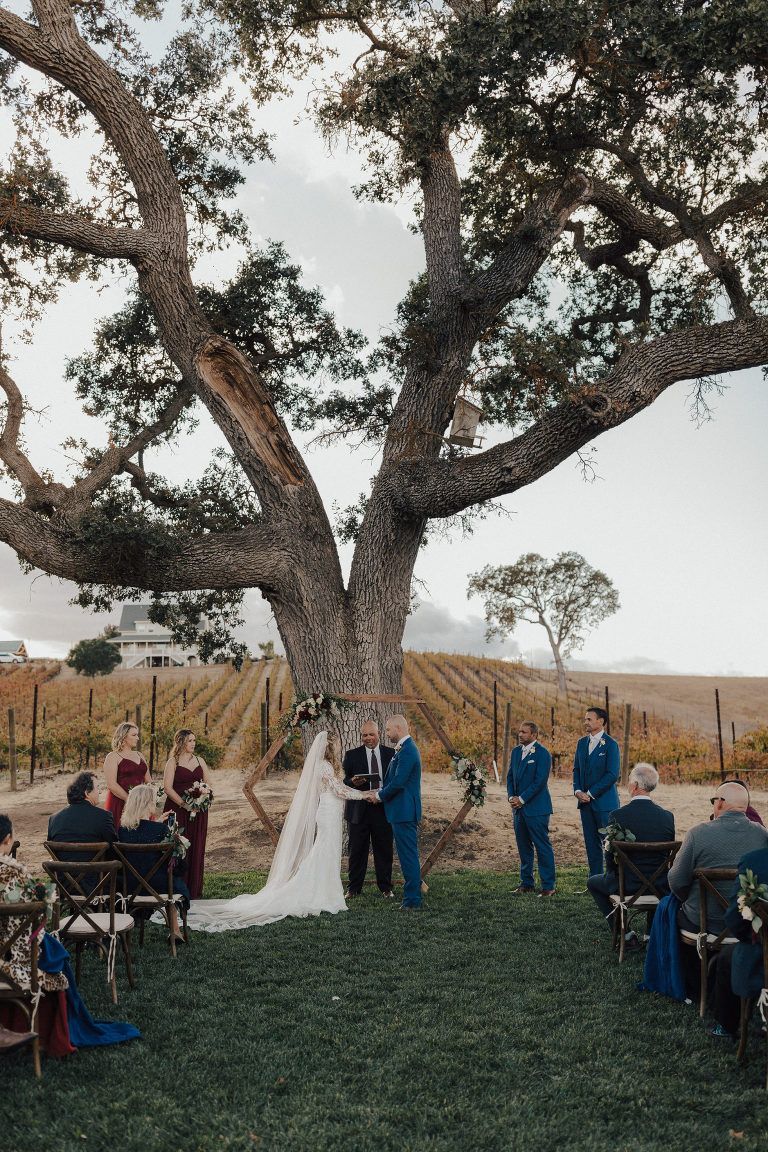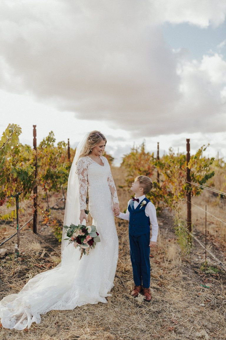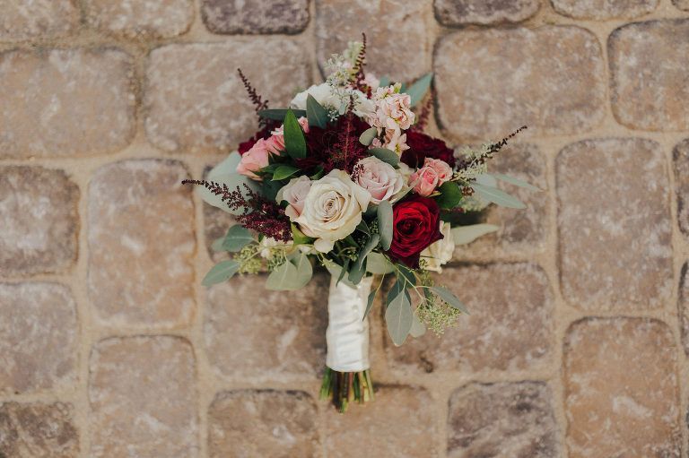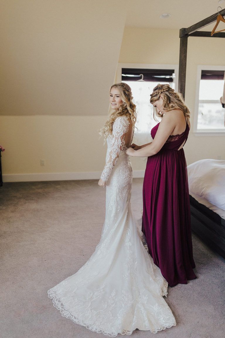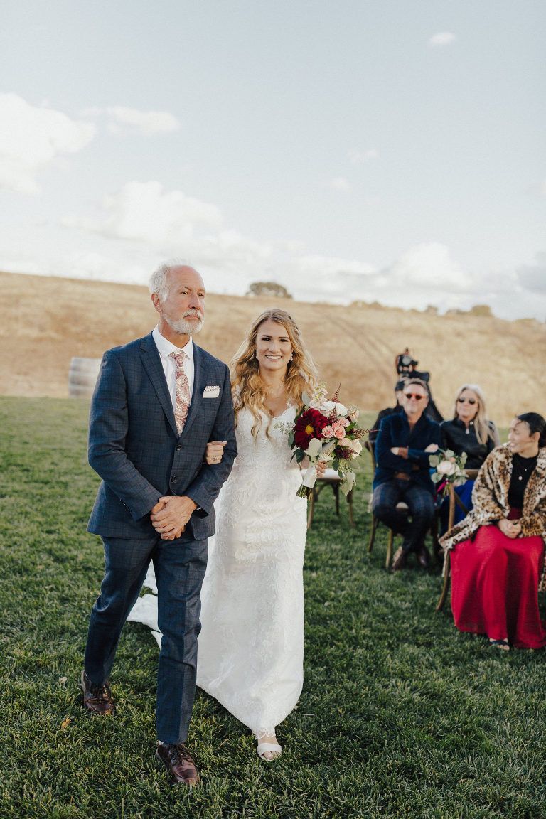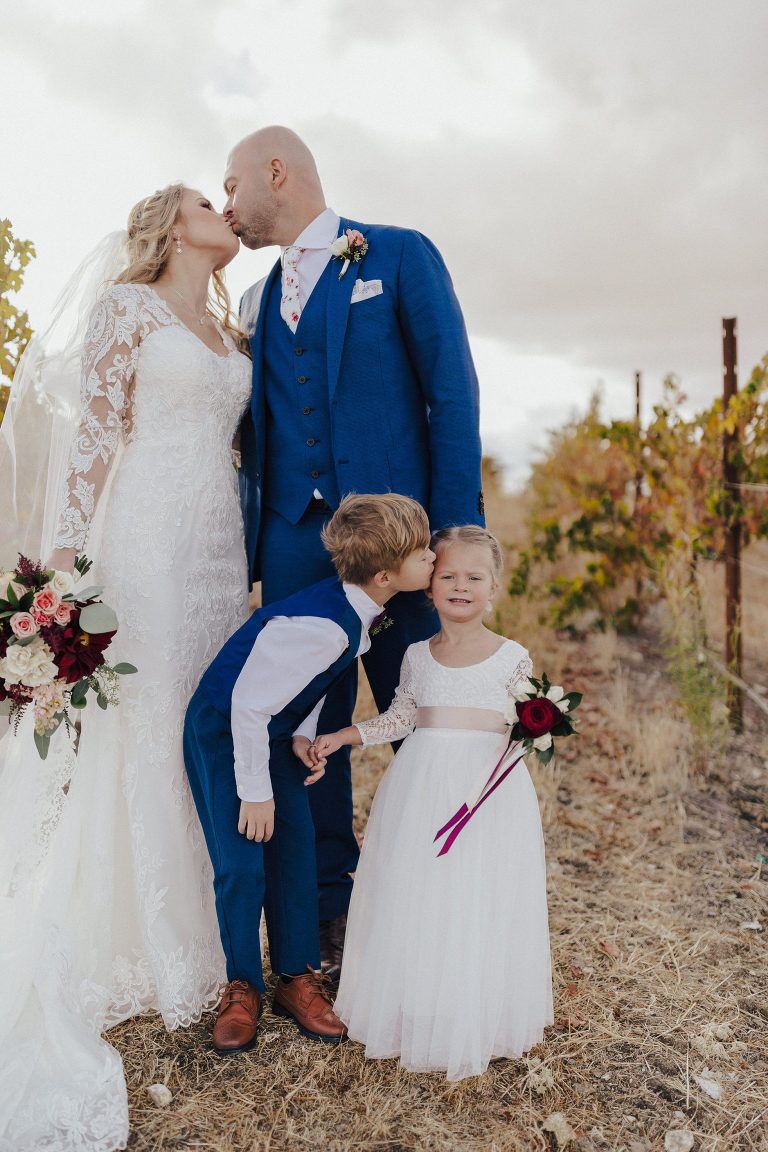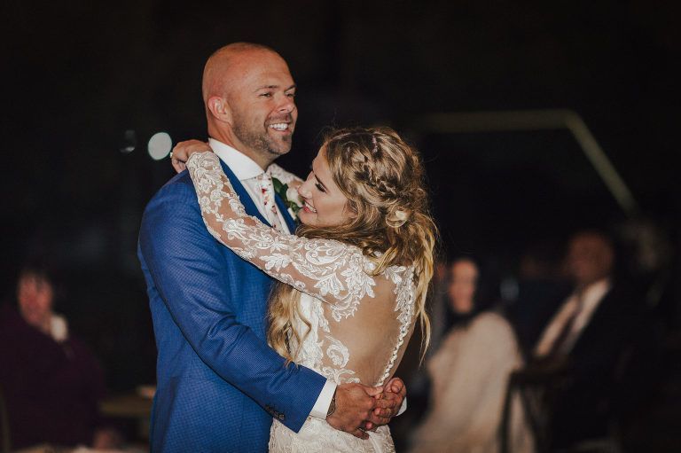 Aaron and Katelyn’s family-filled November nuptials were nothing short of incredible! Their wedding featured a ruby red and navy blue color scheme with a mix of classic and rustic elements. Their ceremony took place under the oak tree, in front of a rustic wooden hexagon arch and included a special family ritual. Katelyn’s bridal look was made complete with a long sleeve lace gown from Something Bridal Boutique , floor length veil, and faux fur coat. Her hair and make-up by The Blushed Company completed the look by styling her long blonde hair with loose curls and pinned it half up with wispy braids. Her flower girl’s dress matched perfectly, who was also in a long sleeve lace gown which was cinched with a cream satin bow and paired with her braided hair. Their special day was filled with sweet, tender moments captured by Lindsey Gomes Photography and Fig Leaf Video .