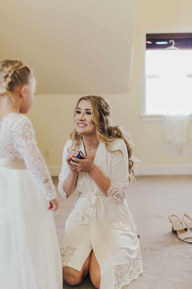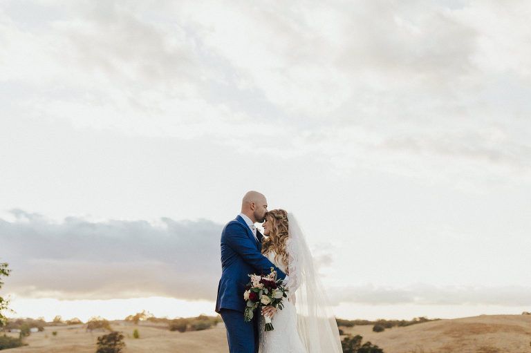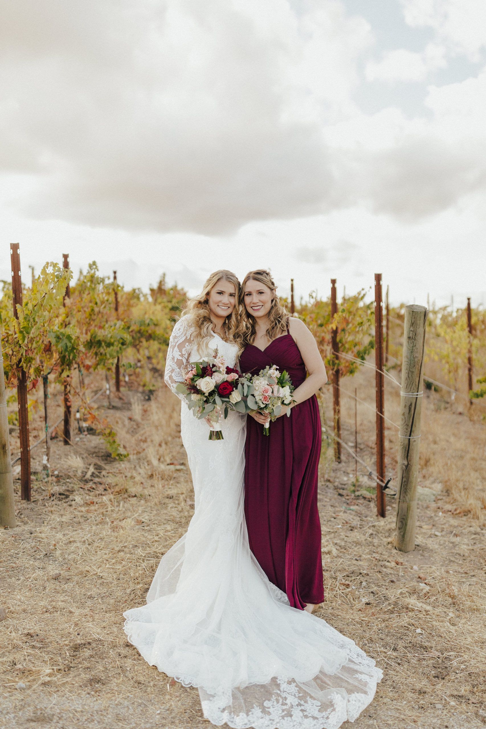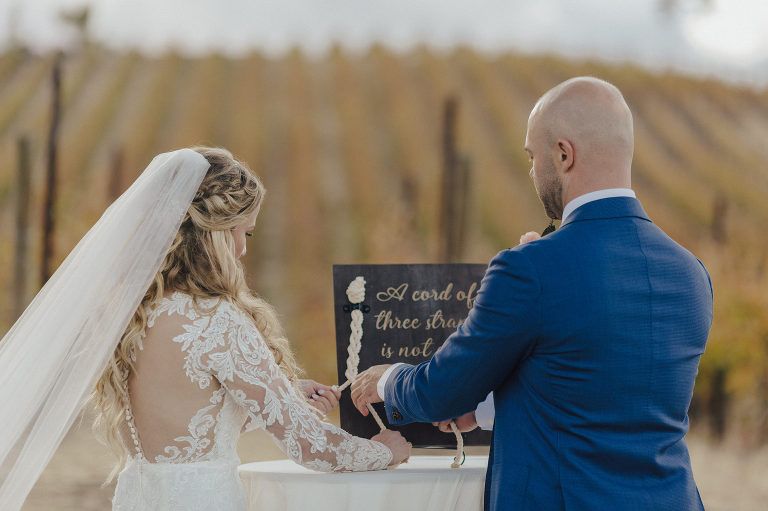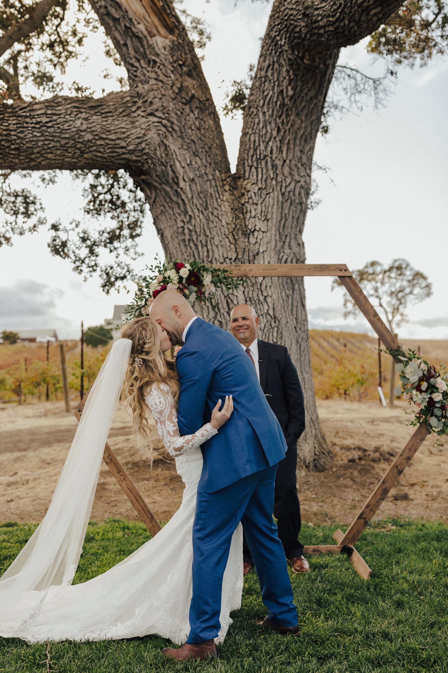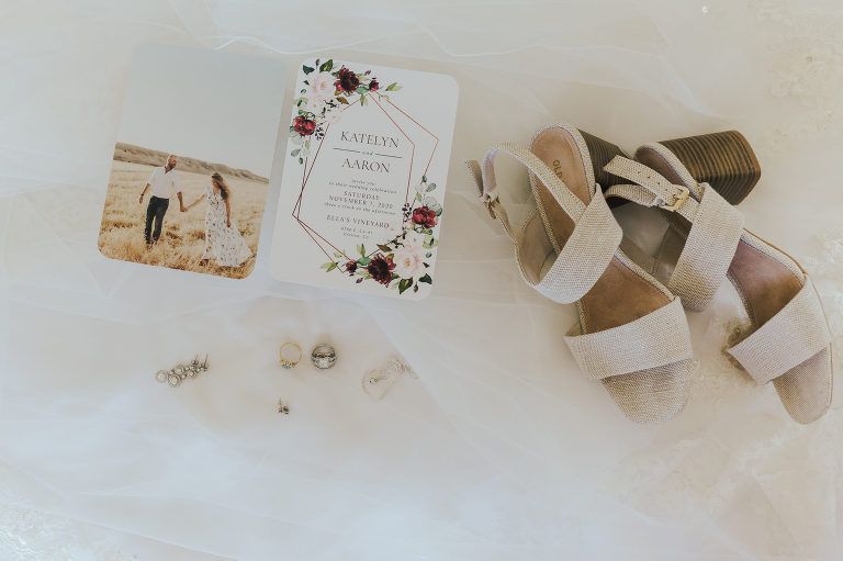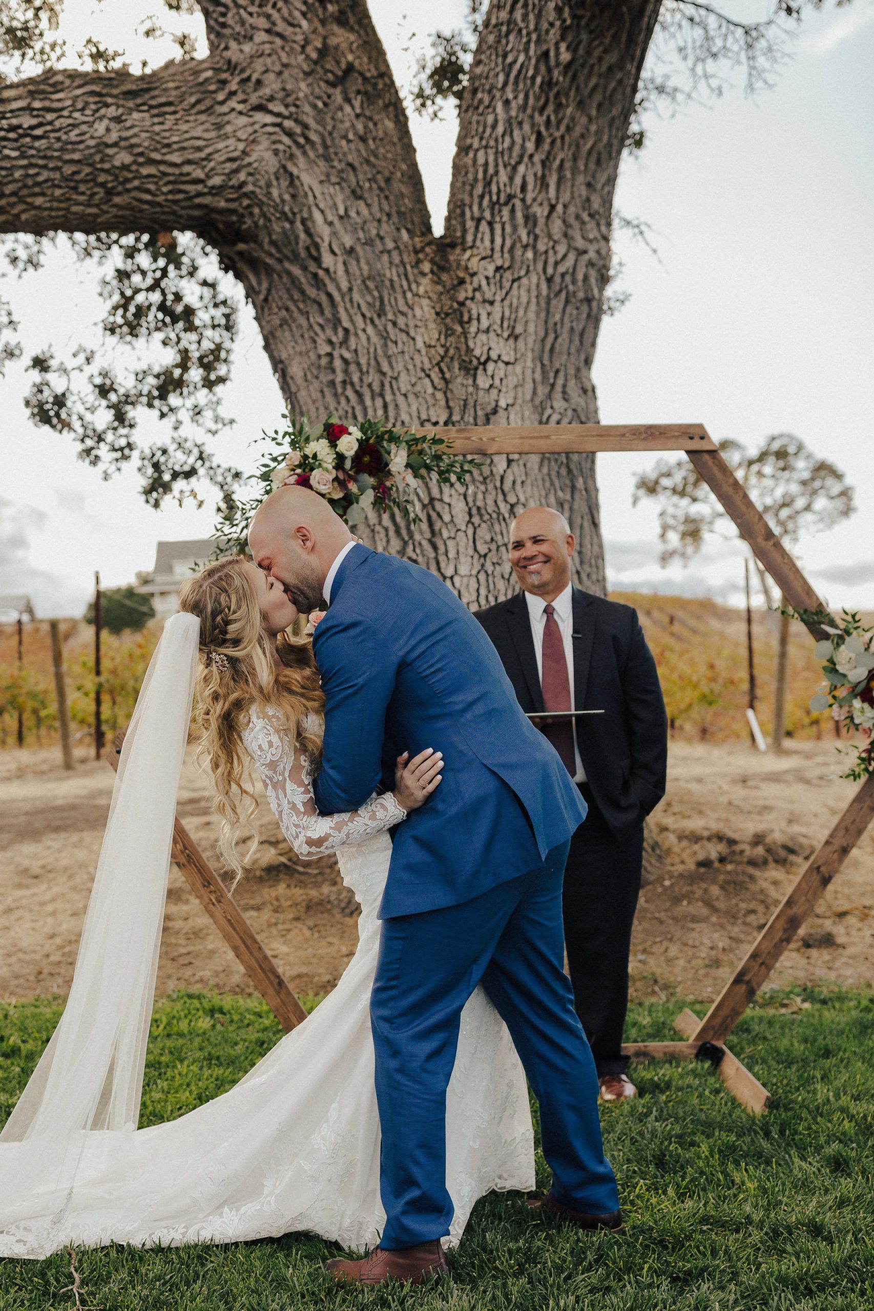 Aaron and Katelyn’s family-filled November nuptials were nothing short of incredible! Their wedding featured a ruby red and navy blue color scheme with a mix of classic and rustic elements. Their ceremony took place under the oak tree, in front of a rustic wooden hexagon arch and included a special family ritual. Katelyn’s bridal look was made complete with a long sleeve lace gown from Something Bridal Boutique , floor length veil, and faux fur coat. Her hair and make-up by The Blushed Company completed the look by styling her long blonde hair with loose curls and pinned it half up with wispy braids. Her flower girl’s dress matched perfectly, who was also in a long sleeve lace gown which was cinched with a cream satin bow and paired with her braided hair. Their special day was filled with sweet, tender moments captured by Lindsey Gomes Photography and Fig Leaf Video .