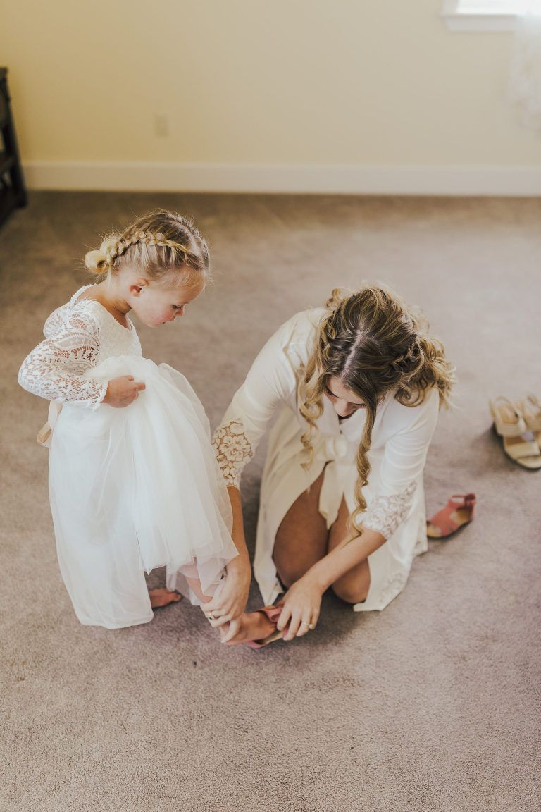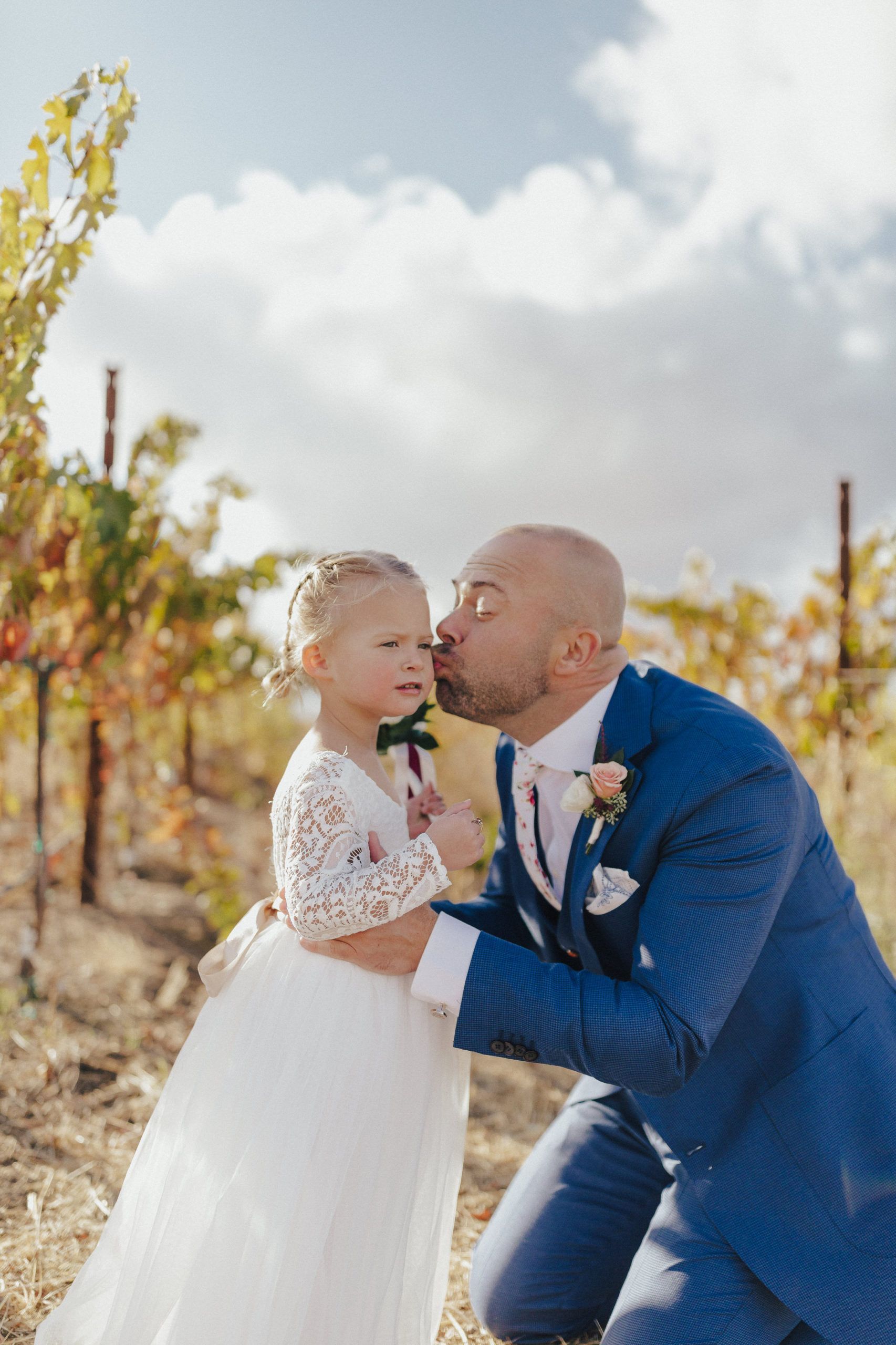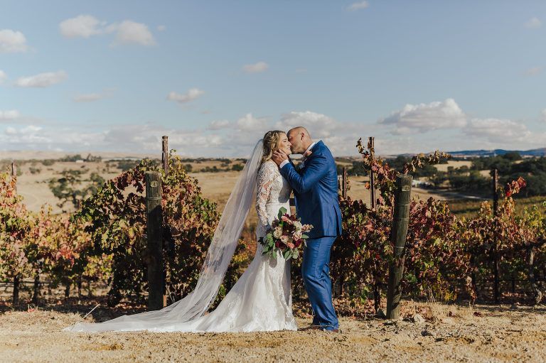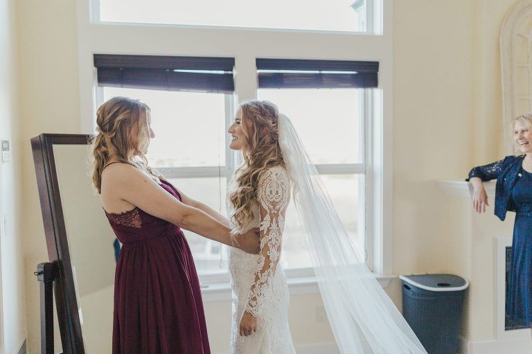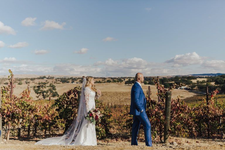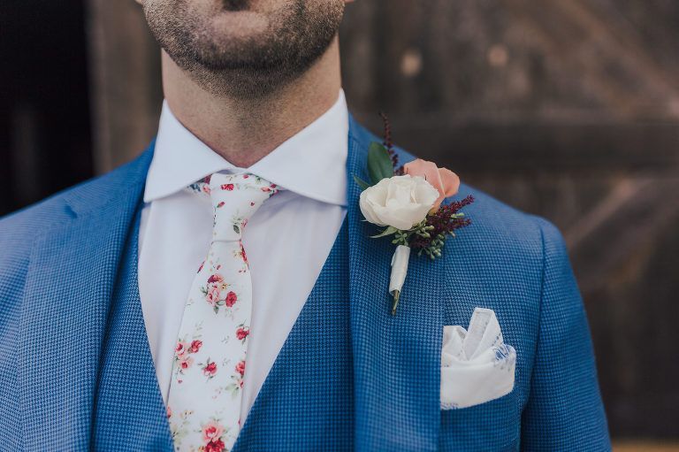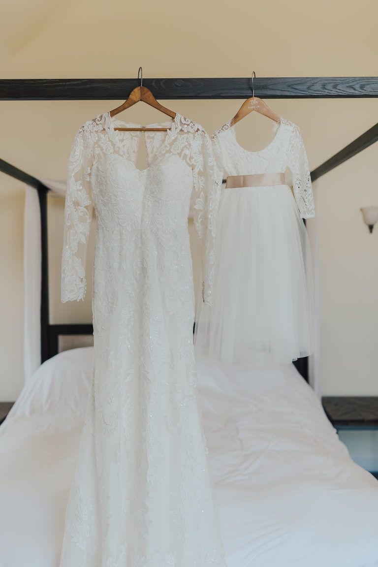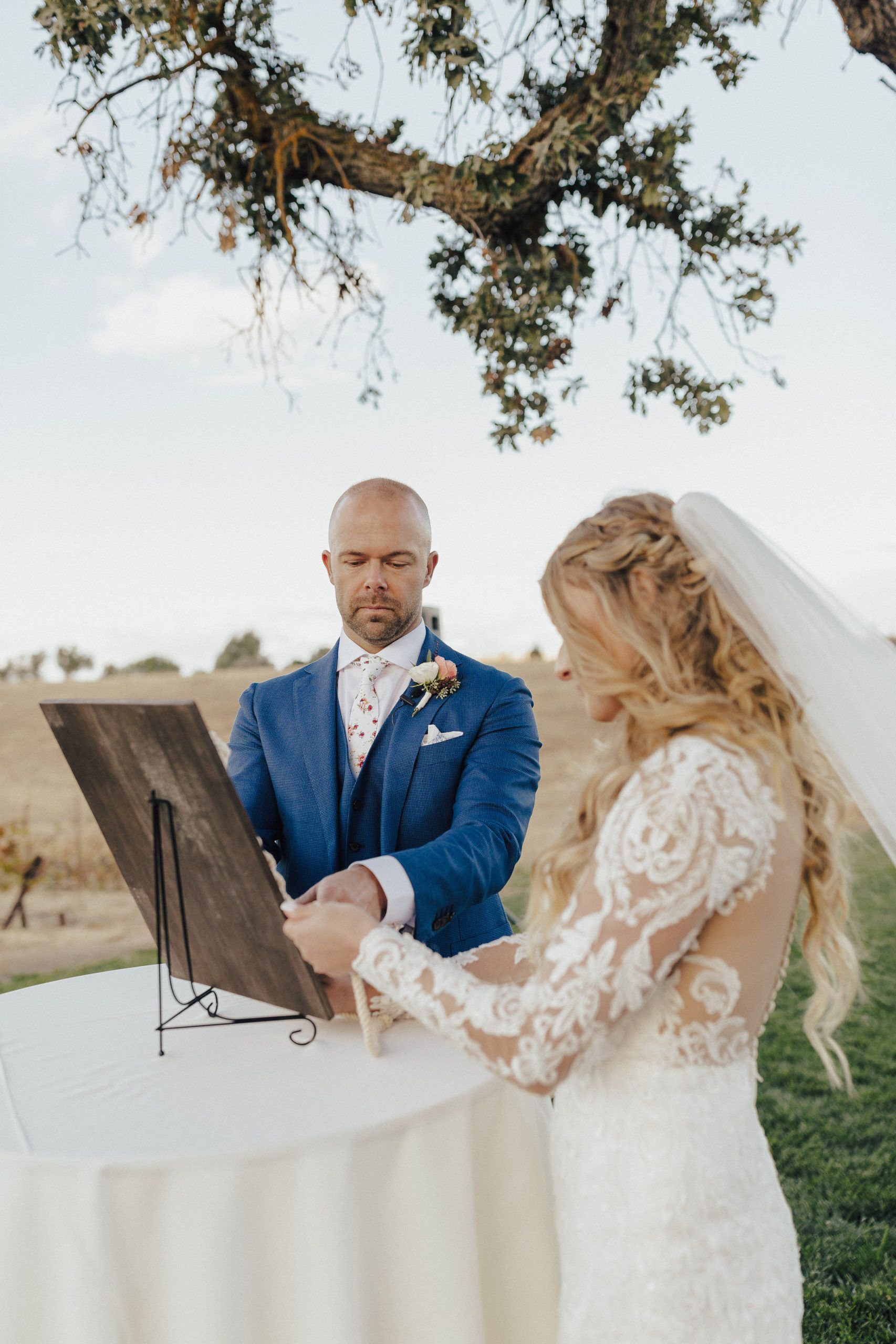 Aaron and Katelyn’s family-filled November nuptials were nothing short of incredible! Their wedding featured a ruby red and navy blue color scheme with a mix of classic and rustic elements. Their ceremony took place under the oak tree, in front of a rustic wooden hexagon arch and included a special family ritual. Katelyn’s bridal look was made complete with a long sleeve lace gown from Something Bridal Boutique , floor length veil, and faux fur coat. Her hair and make-up by The Blushed Company completed the look by styling her long blonde hair with loose curls and pinned it half up with wispy braids. Her flower girl’s dress matched perfectly, who was also in a long sleeve lace gown which was cinched with a cream satin bow and paired with her braided hair. Their special day was filled with sweet, tender moments captured by Lindsey Gomes Photography and Fig Leaf Video .