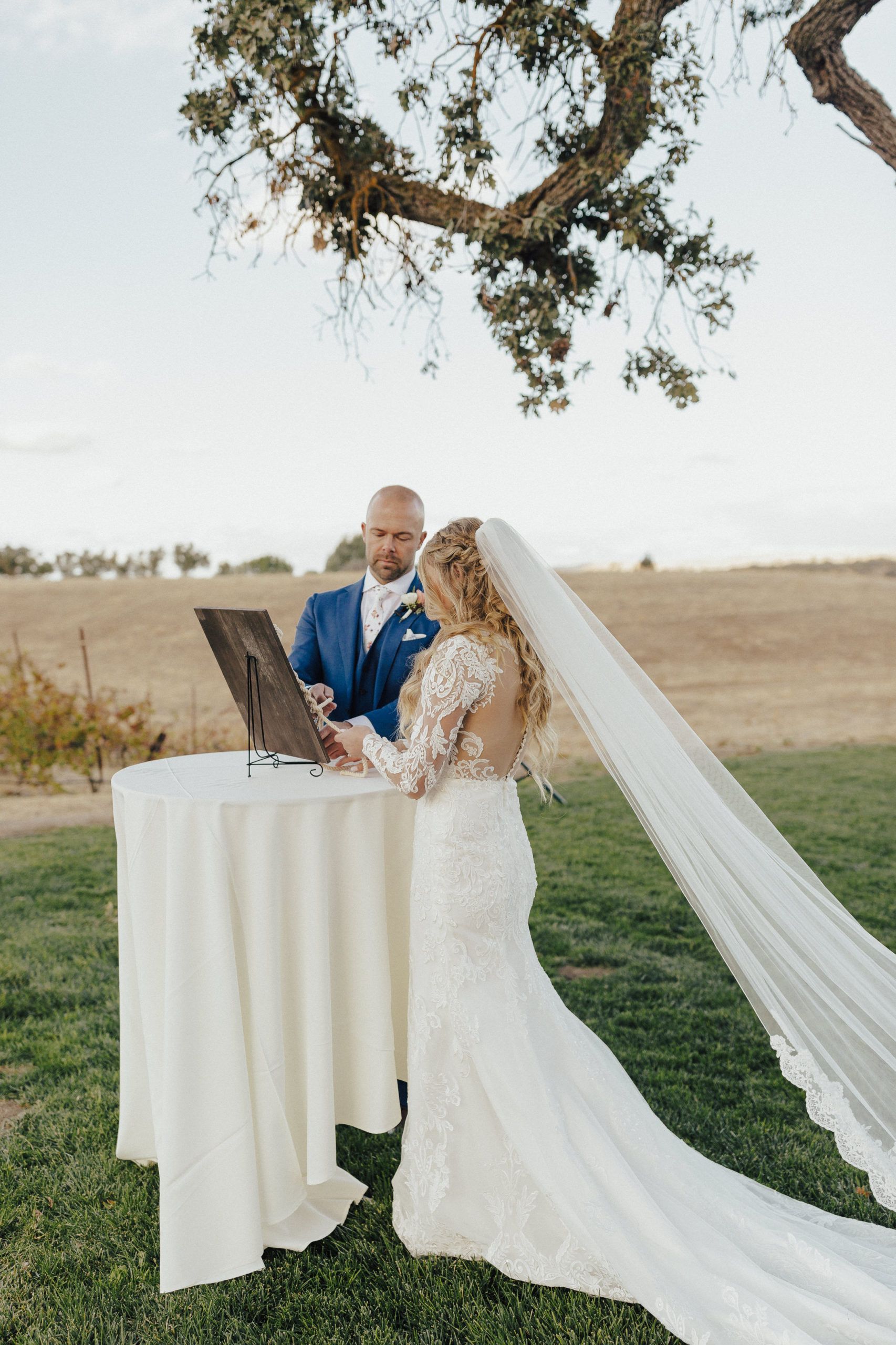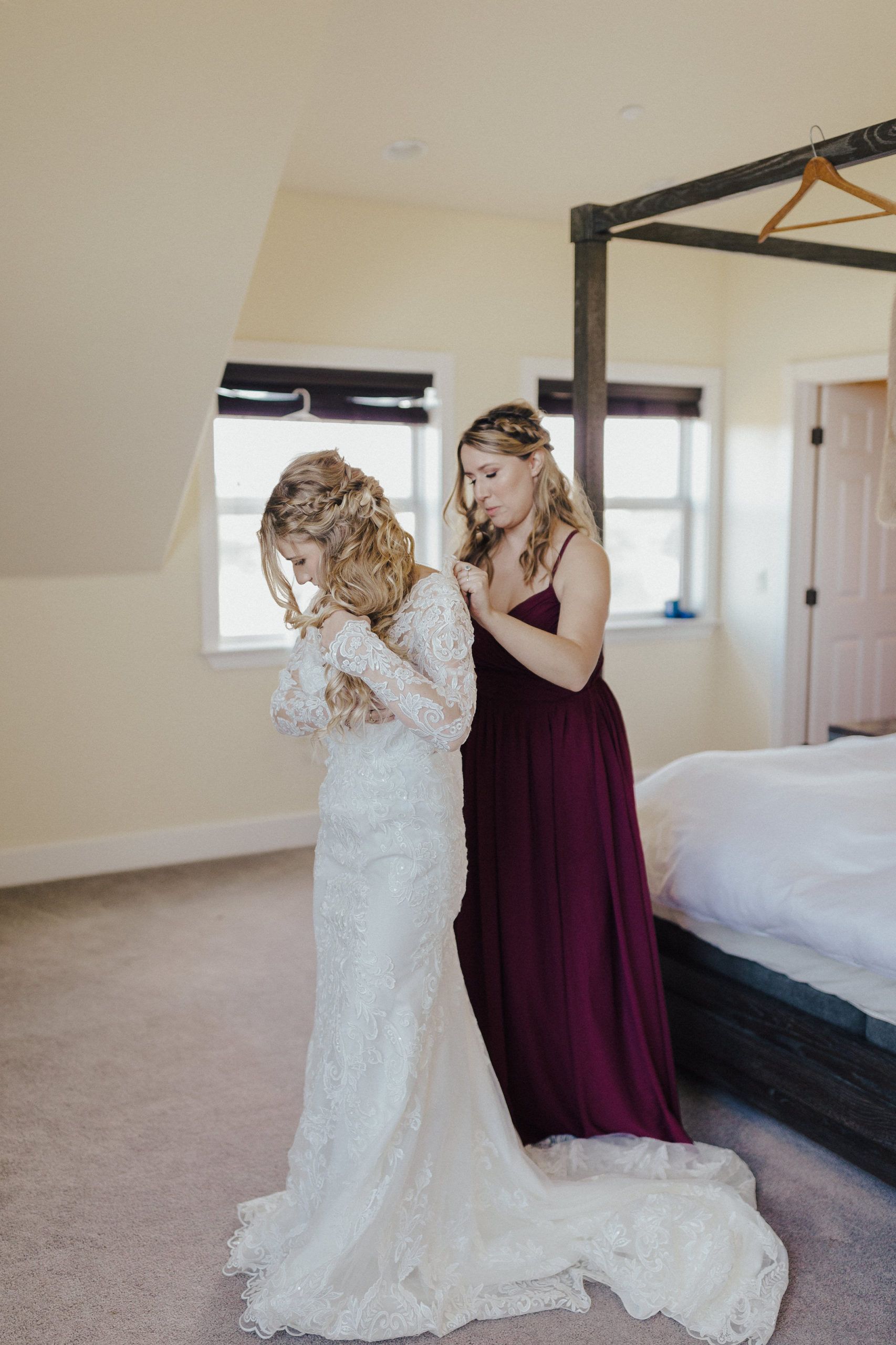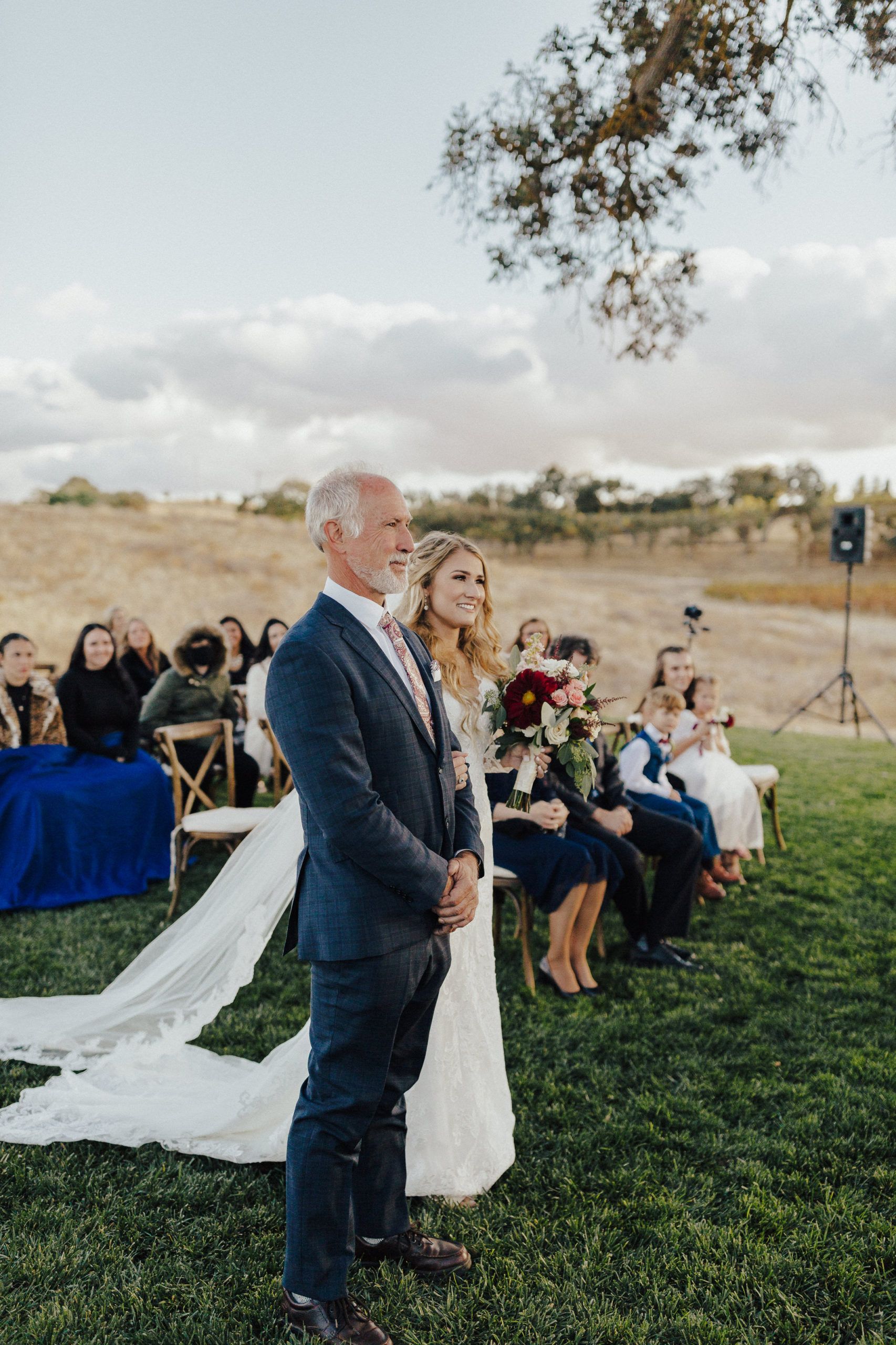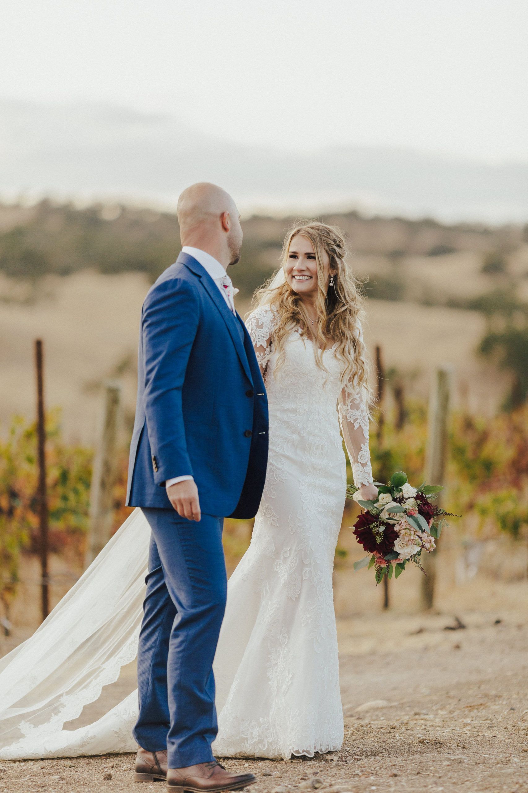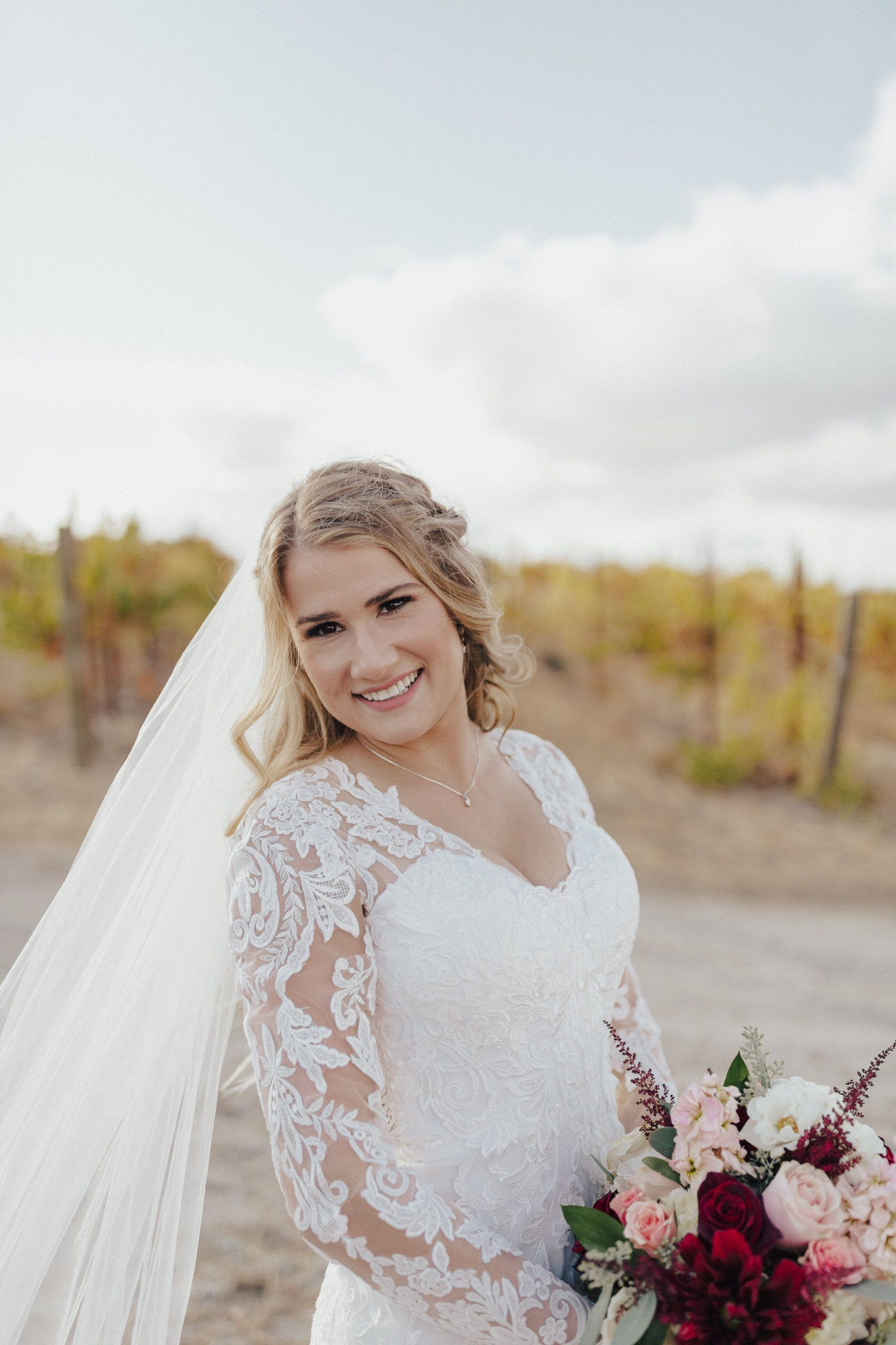 Aaron and Katelyn’s family-filled November nuptials were nothing short of incredible! Their wedding featured a ruby red and navy blue color scheme with a mix of classic and rustic elements. Their ceremony took place under the oak tree, in front of a rustic wooden hexagon arch and included a special family ritual. Katelyn’s bridal look was made complete with a long sleeve lace gown from Something Bridal Boutique , floor length veil, and faux fur coat. Her hair and make-up by The Blushed Company completed the look by styling her long blonde hair with loose curls and pinned it half up with wispy braids. Her flower girl’s dress matched perfectly, who was also in a long sleeve lace gown which was cinched with a cream satin bow and paired with her braided hair. Their special day was filled with sweet, tender moments captured by Lindsey Gomes Photography and Fig Leaf Video .