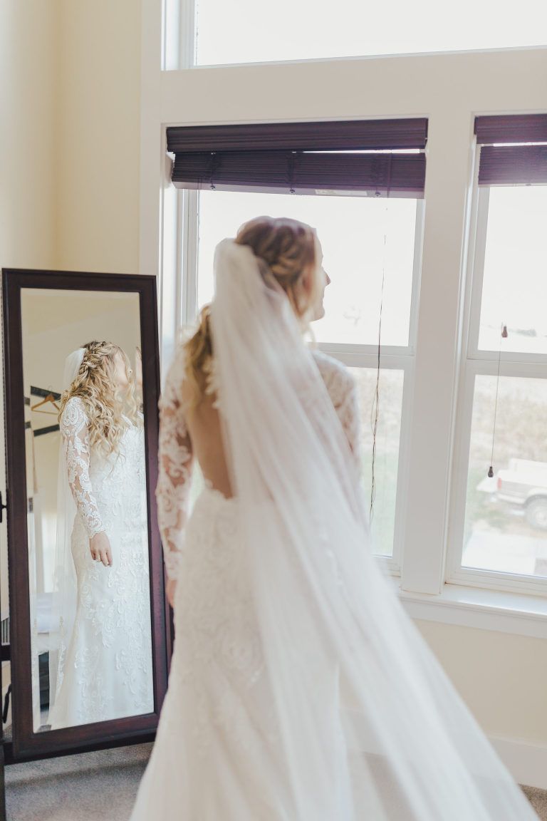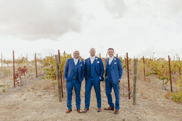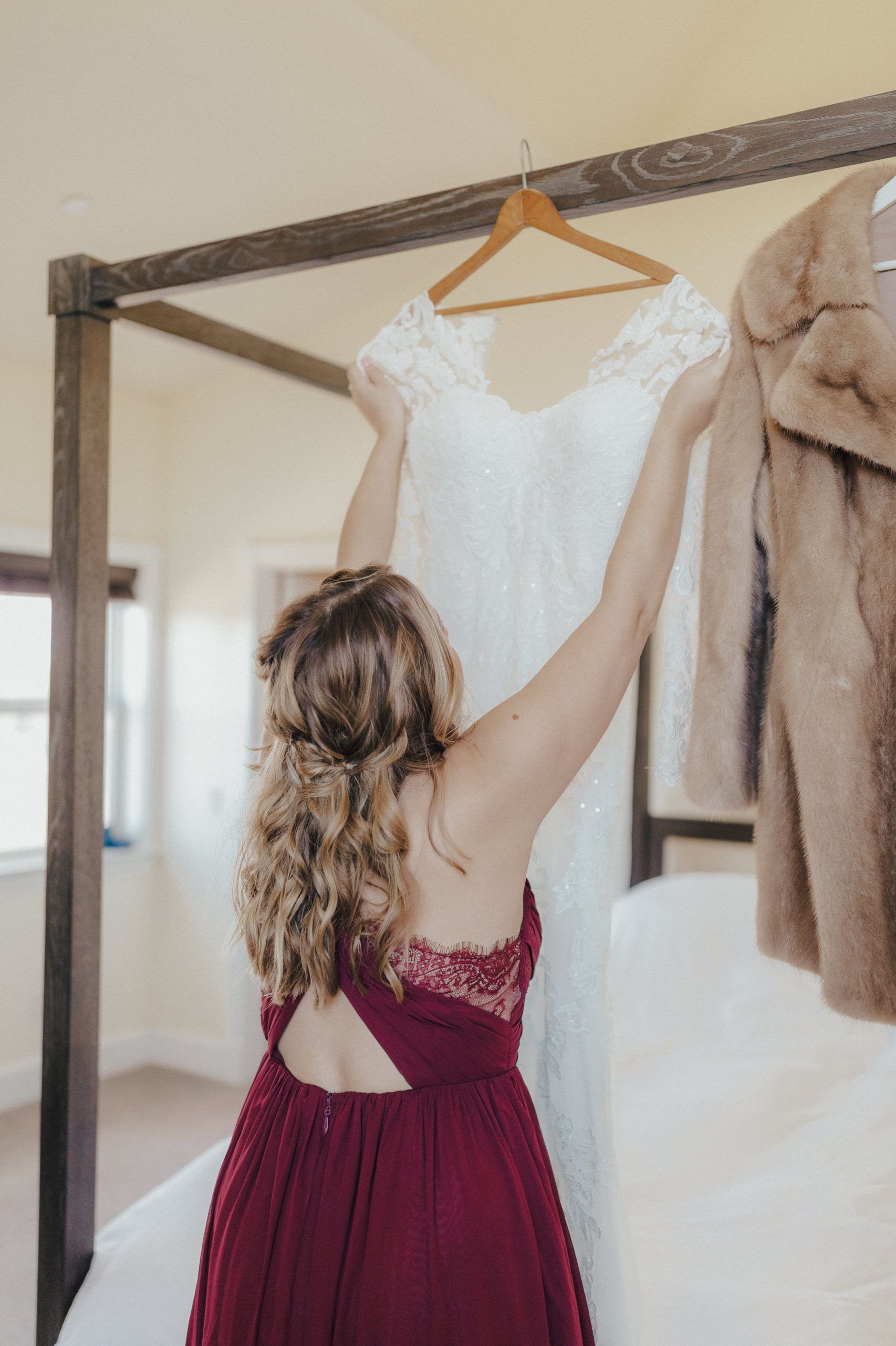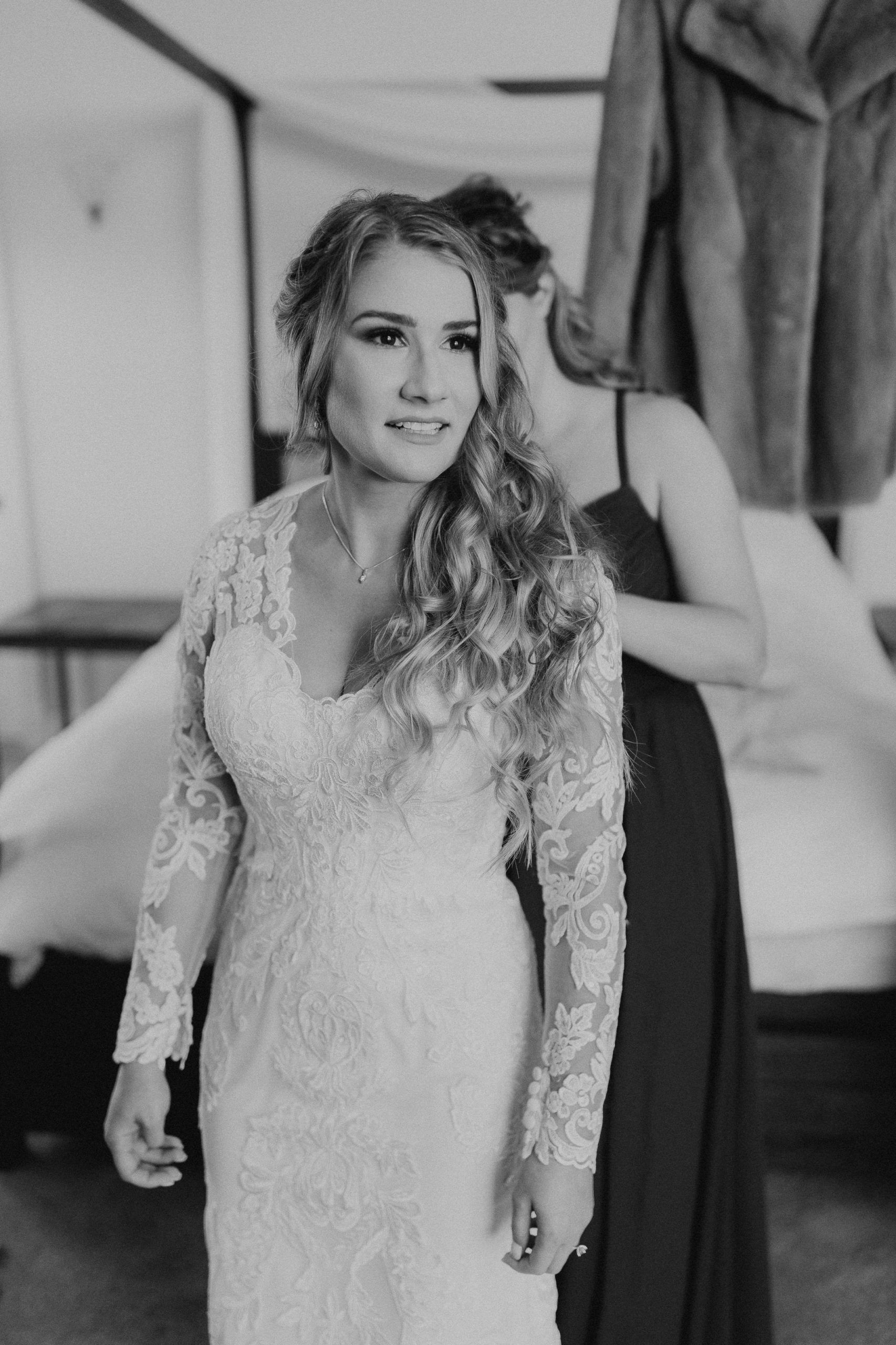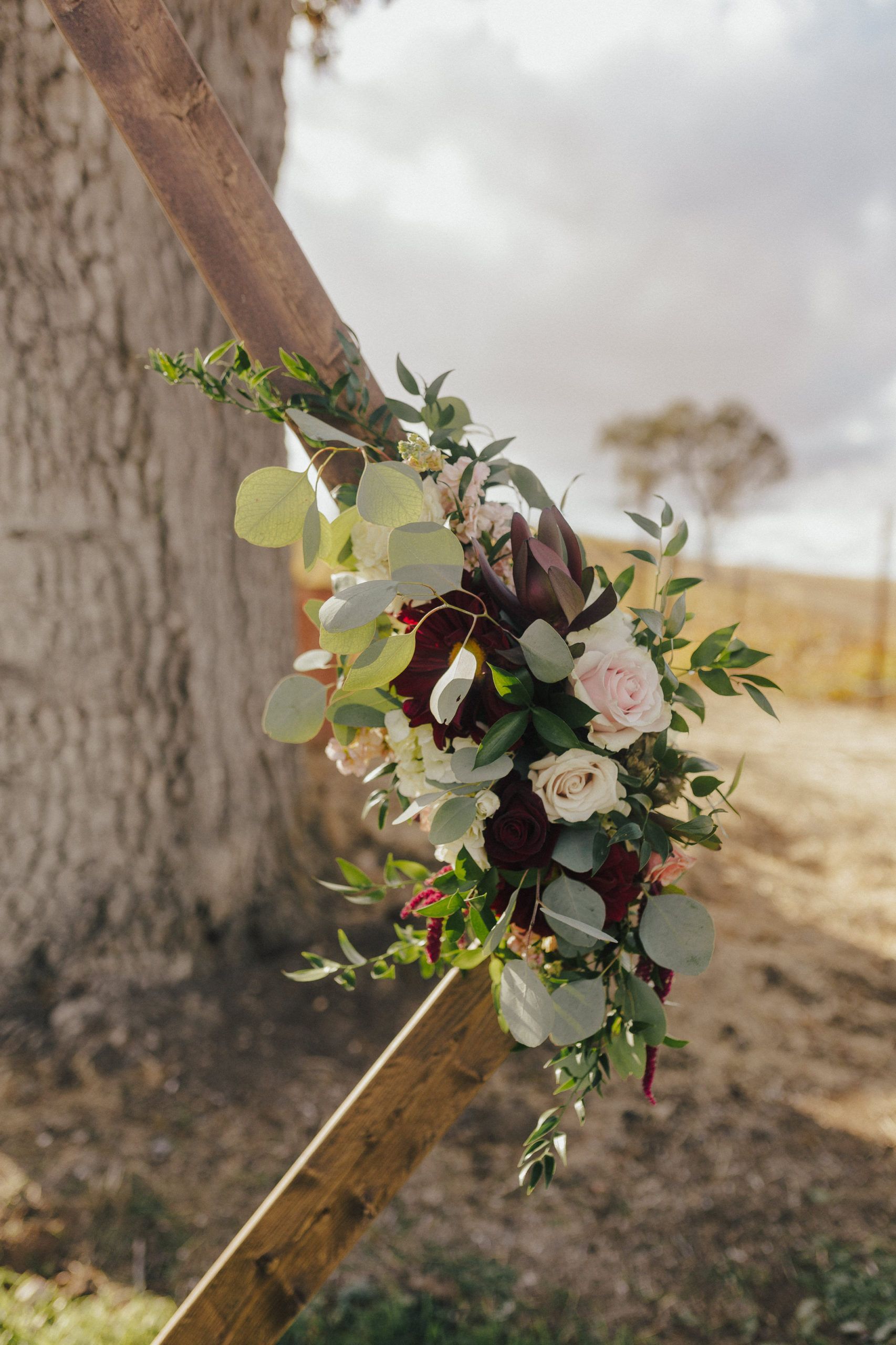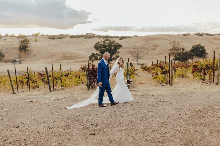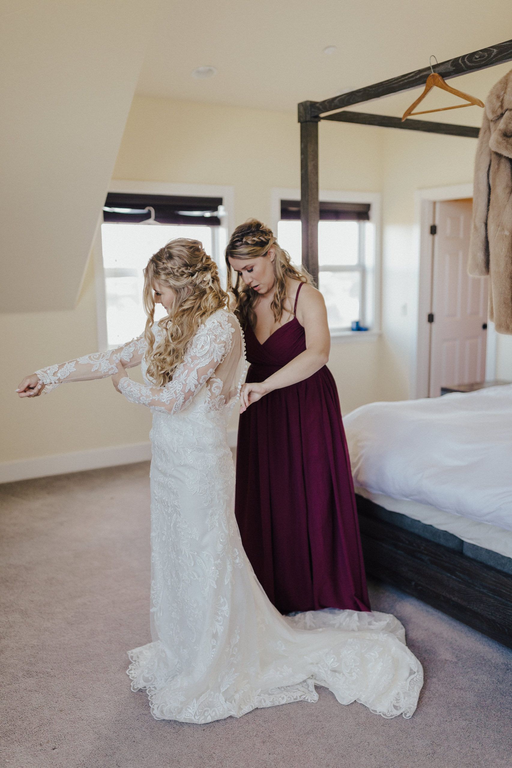 Aaron and Katelyn’s family-filled November nuptials were nothing short of incredible! Their wedding featured a ruby red and navy blue color scheme with a mix of classic and rustic elements. Their ceremony took place under the oak tree, in front of a rustic wooden hexagon arch and included a special family ritual. Katelyn’s bridal look was made complete with a long sleeve lace gown from Something Bridal Boutique , floor length veil, and faux fur coat. Her hair and make-up by The Blushed Company completed the look by styling her long blonde hair with loose curls and pinned it half up with wispy braids. Her flower girl’s dress matched perfectly, who was also in a long sleeve lace gown which was cinched with a cream satin bow and paired with her braided hair. Their special day was filled with sweet, tender moments captured by Lindsey Gomes Photography and Fig Leaf Video .