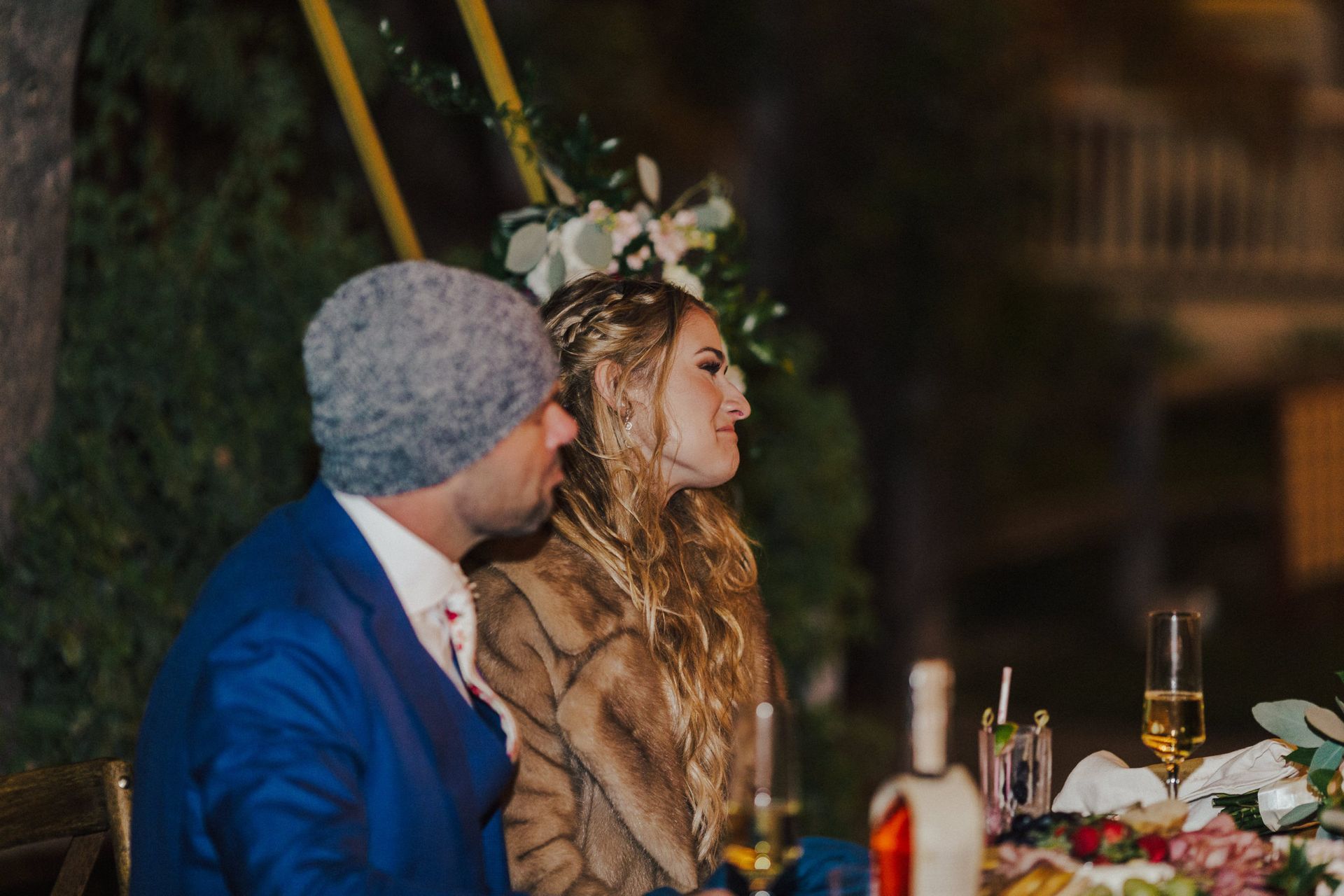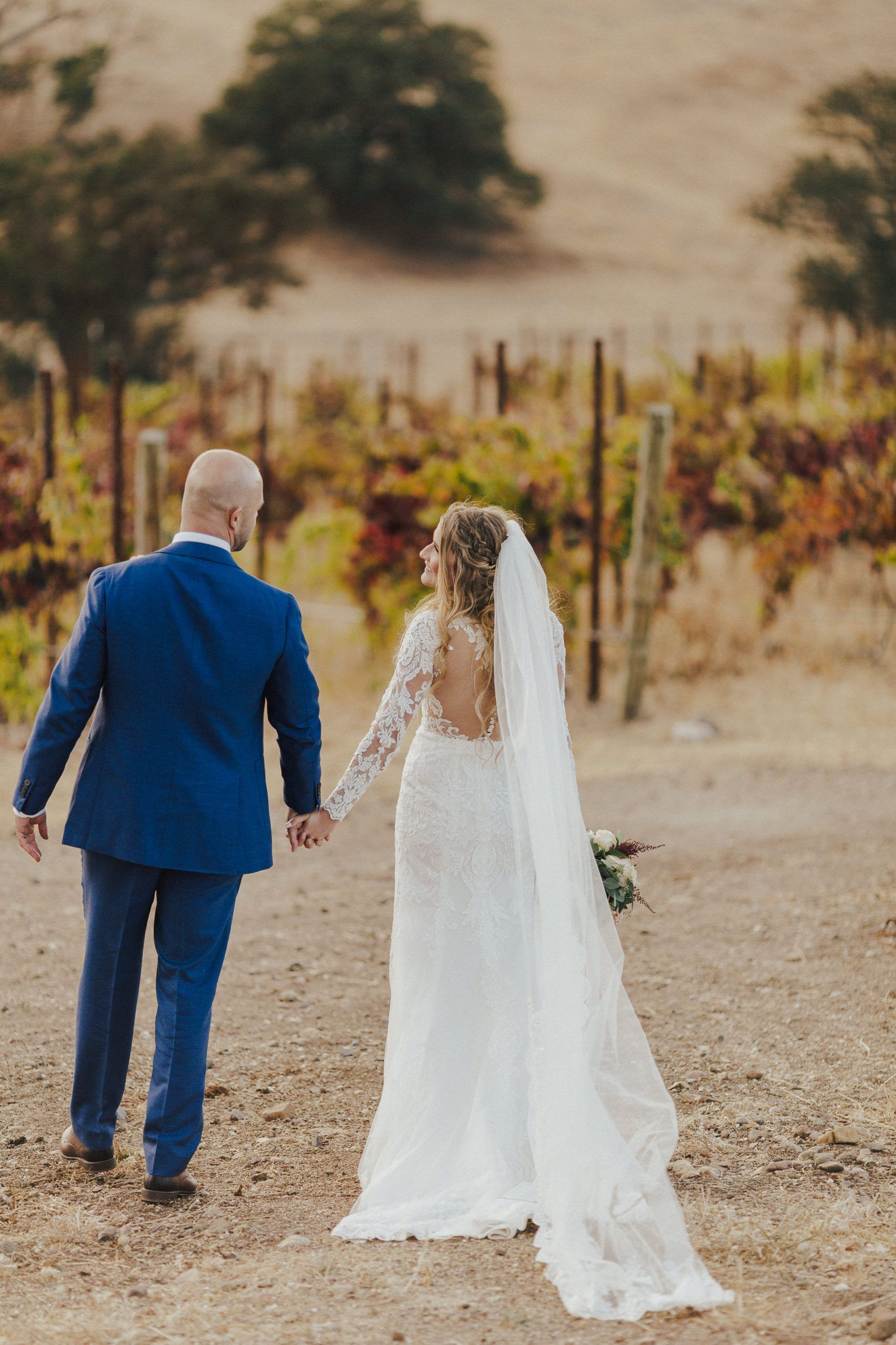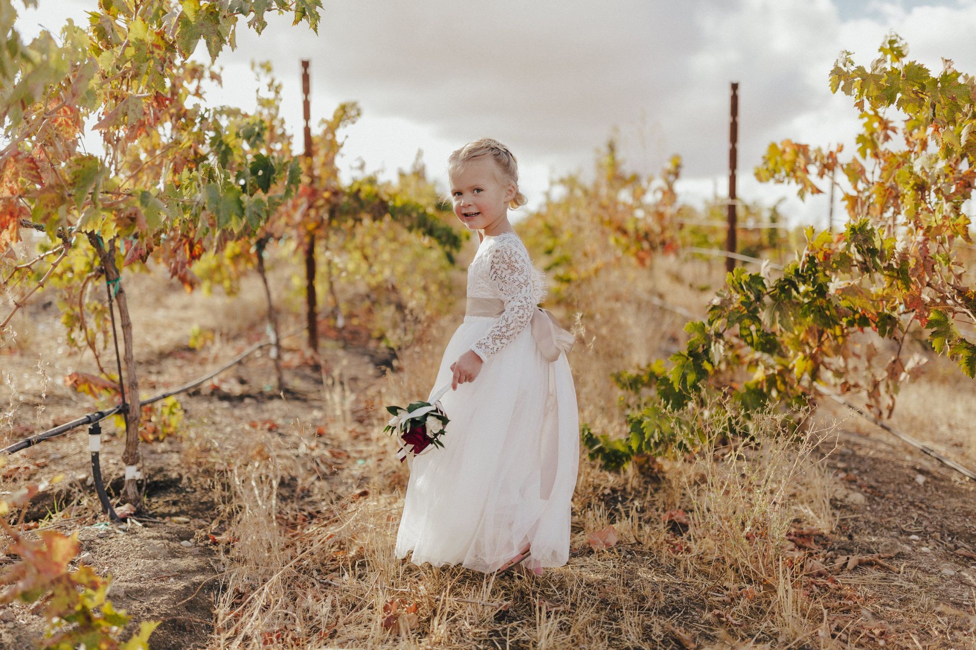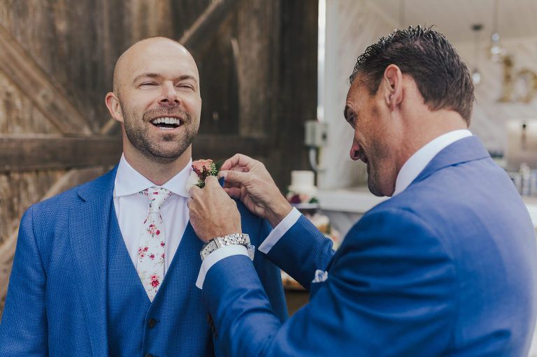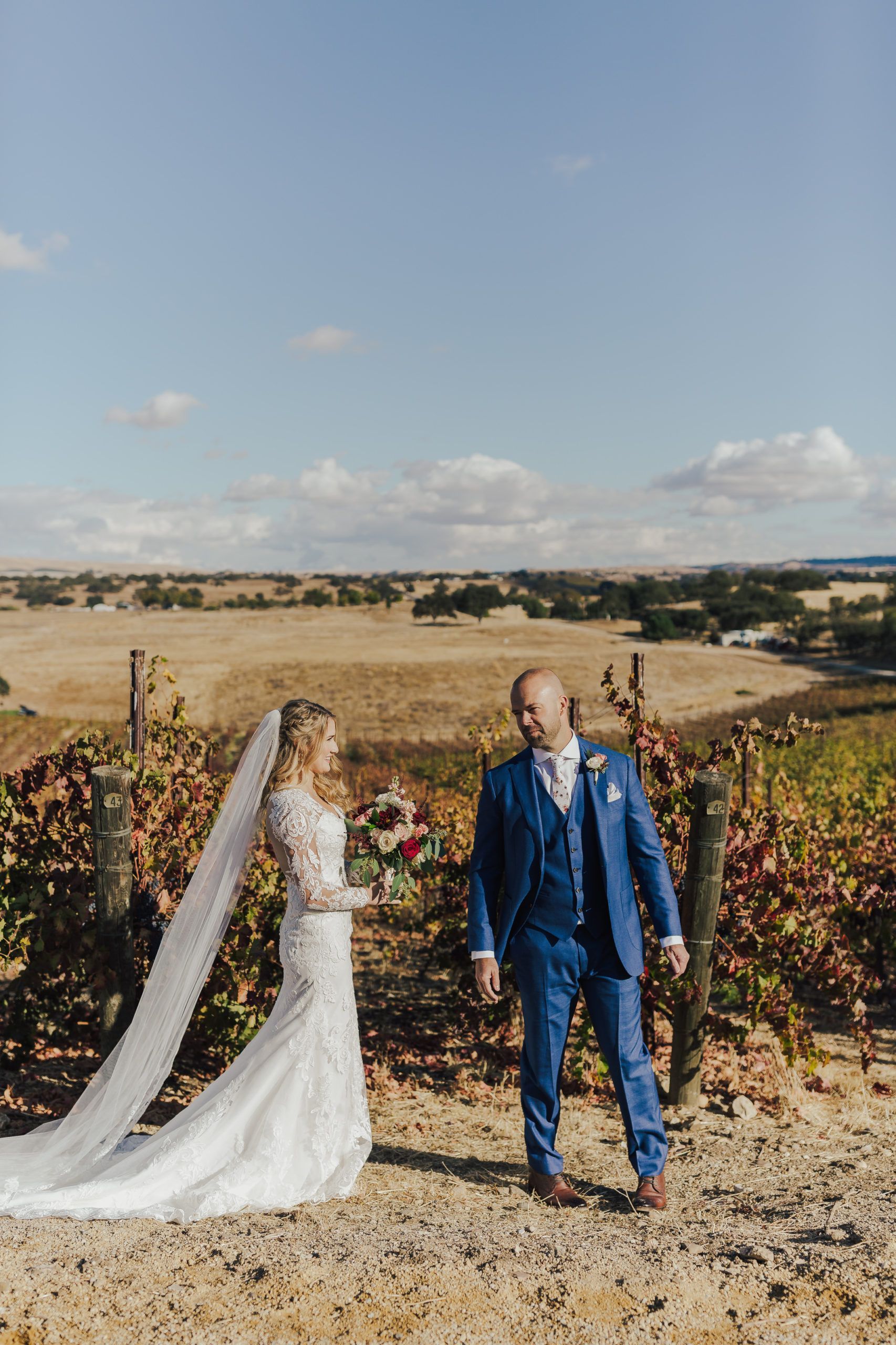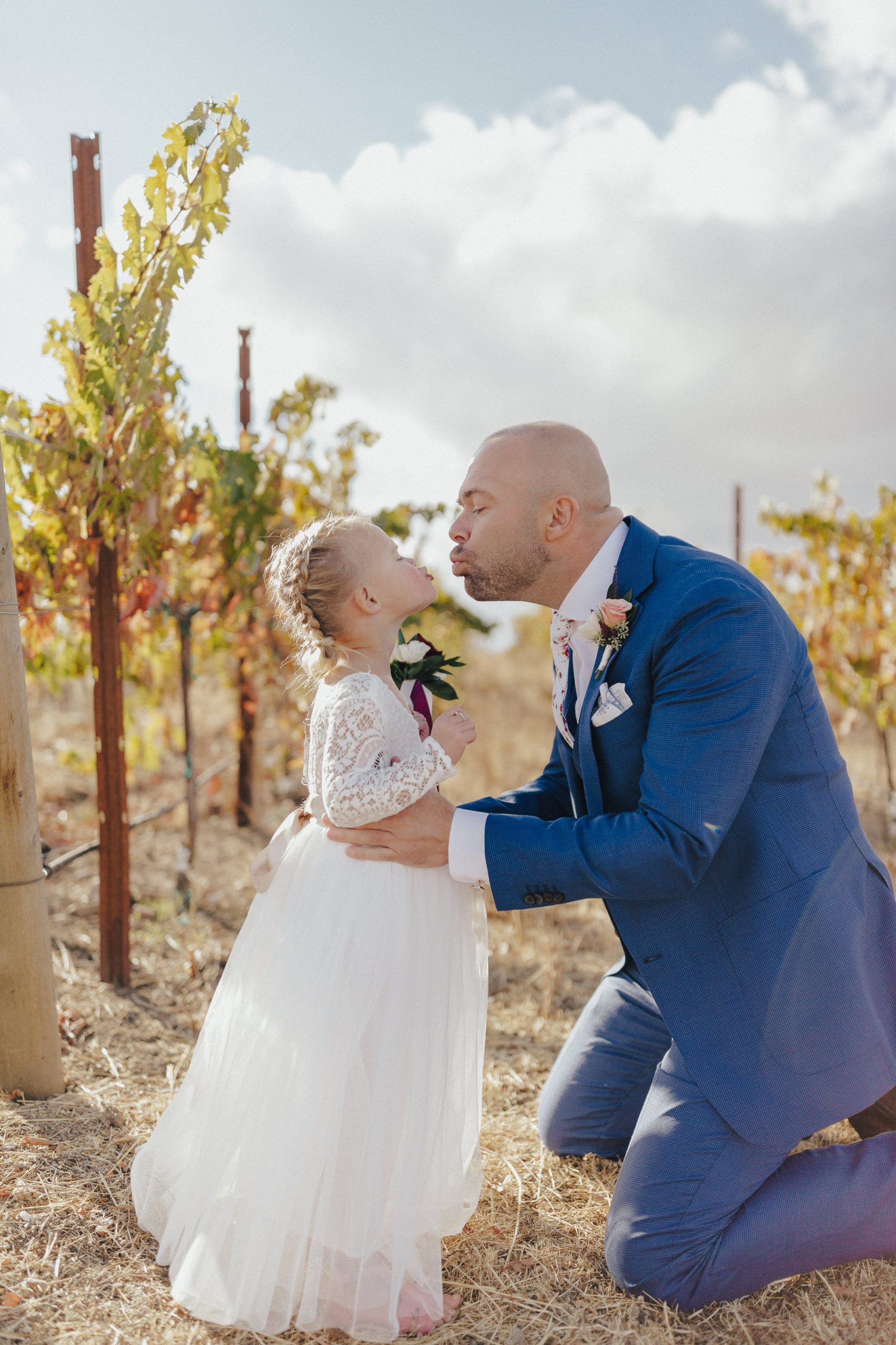 Aaron and Katelyn’s family-filled November nuptials were nothing short of incredible! Their wedding featured a ruby red and navy blue color scheme with a mix of classic and rustic elements. Their ceremony took place under the oak tree, in front of a rustic wooden hexagon arch and included a special family ritual. Katelyn’s bridal look was made complete with a long sleeve lace gown from Something Bridal Boutique , floor length veil, and faux fur coat. Her hair and make-up by The Blushed Company completed the look by styling her long blonde hair with loose curls and pinned it half up with wispy braids. Her flower girl’s dress matched perfectly, who was also in a long sleeve lace gown which was cinched with a cream satin bow and paired with her braided hair. Their special day was filled with sweet, tender moments captured by Lindsey Gomes Photography and Fig Leaf Video .