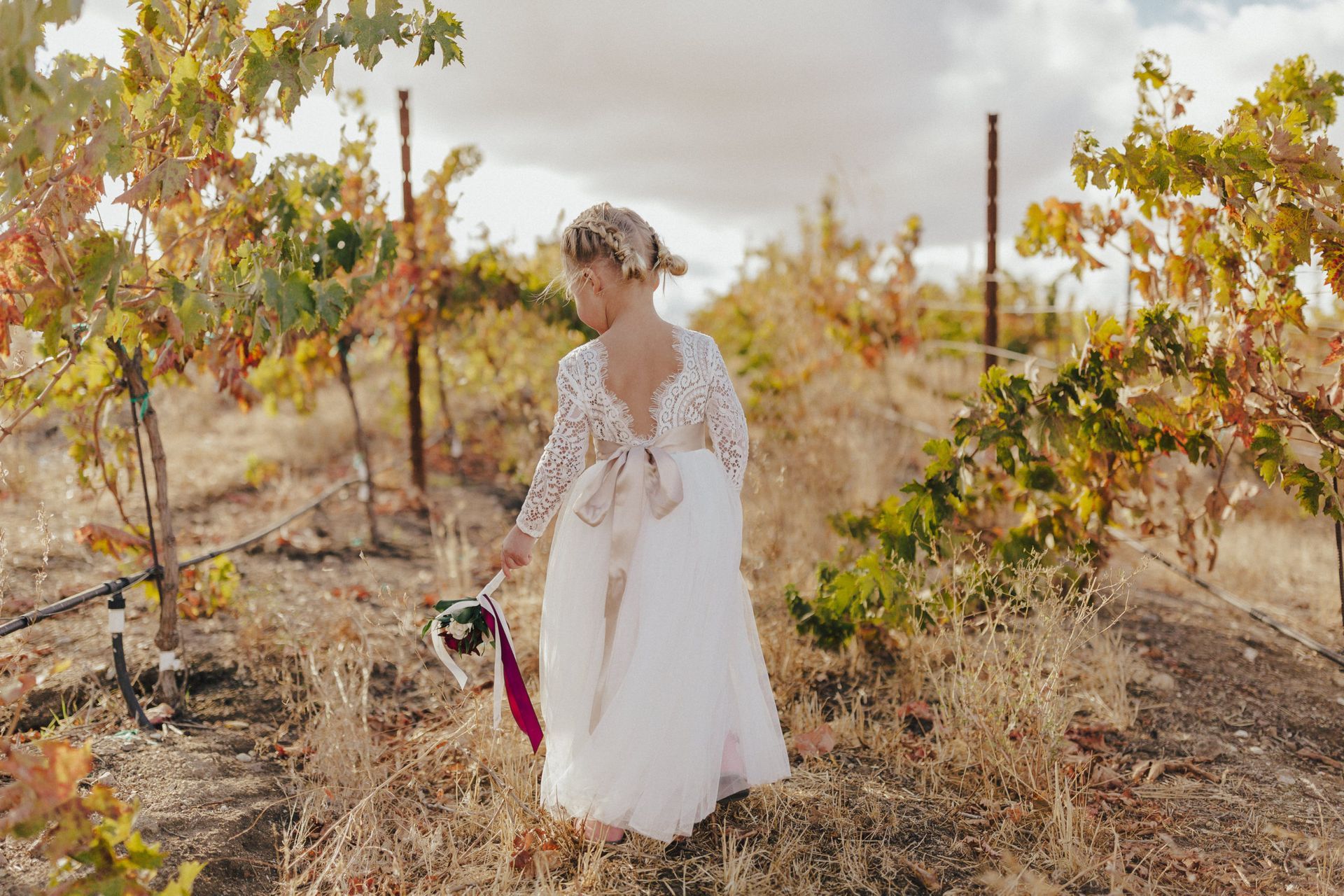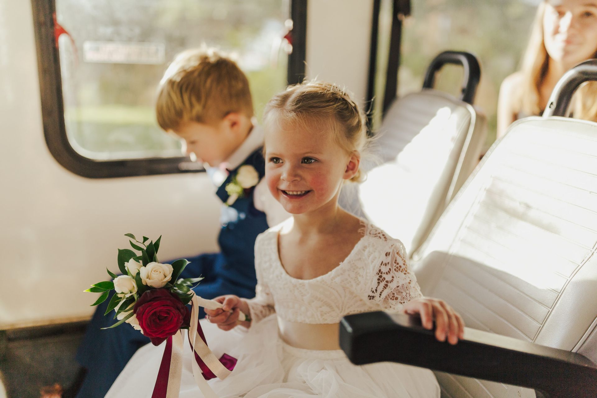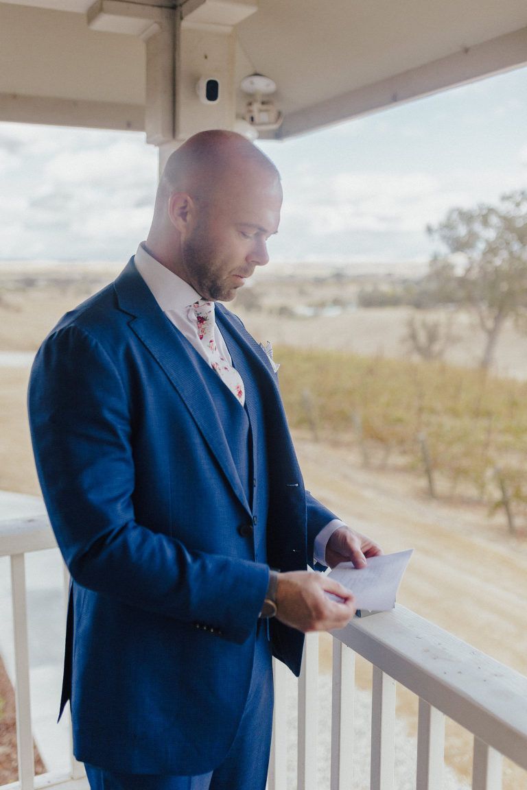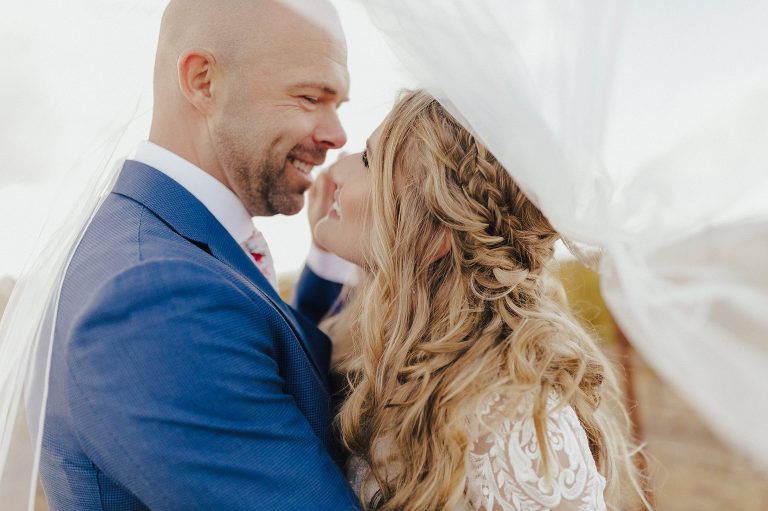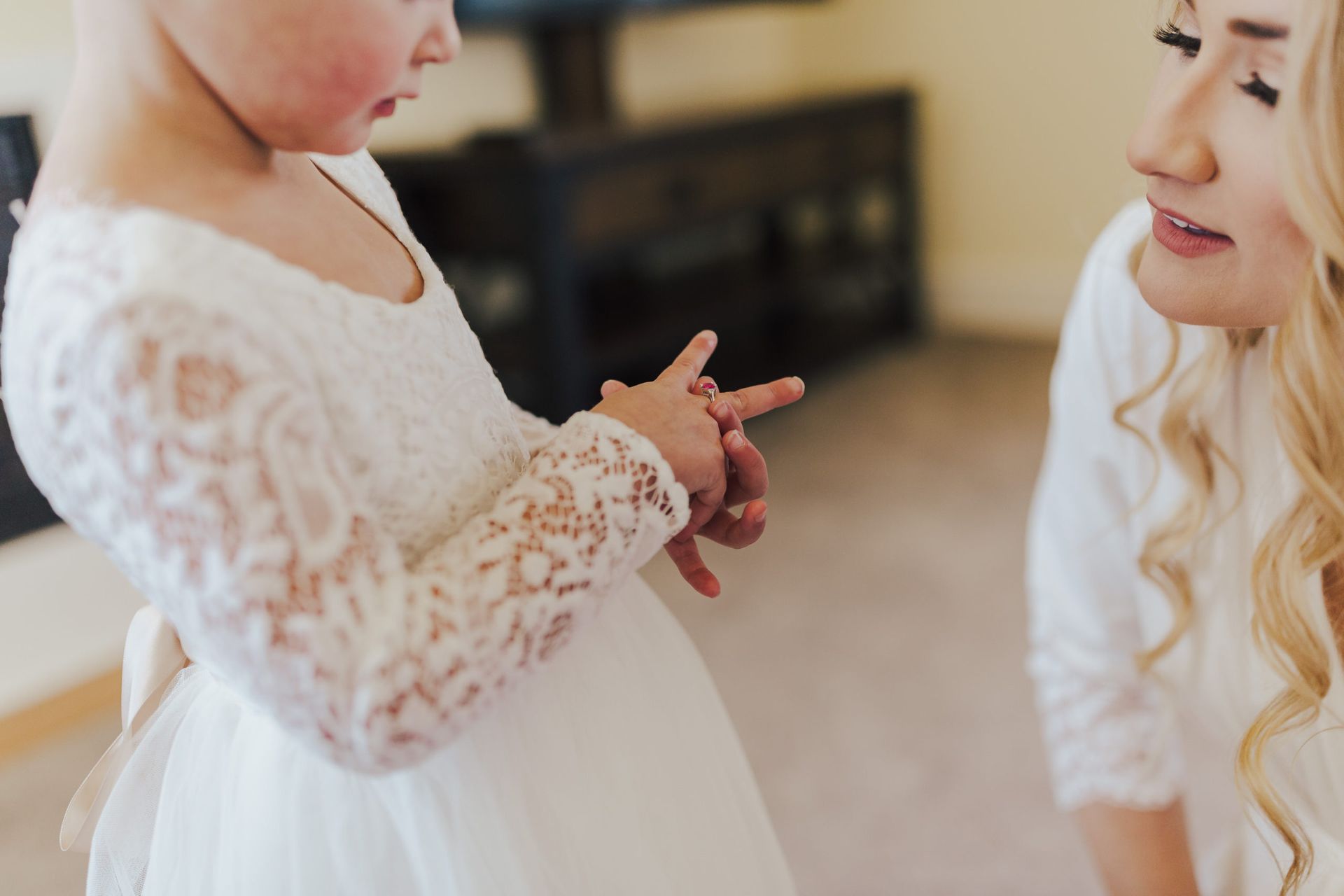 Aaron and Katelyn’s family-filled November nuptials were nothing short of incredible! Their wedding featured a ruby red and navy blue color scheme with a mix of classic and rustic elements. Their ceremony took place under the oak tree, in front of a rustic wooden hexagon arch and included a special family ritual. Katelyn’s bridal look was made complete with a long sleeve lace gown from Something Bridal Boutique , floor length veil, and faux fur coat. Her hair and make-up by The Blushed Company completed the look by styling her long blonde hair with loose curls and pinned it half up with wispy braids. Her flower girl’s dress matched perfectly, who was also in a long sleeve lace gown which was cinched with a cream satin bow and paired with her braided hair. Their special day was filled with sweet, tender moments captured by Lindsey Gomes Photography and Fig Leaf Video .