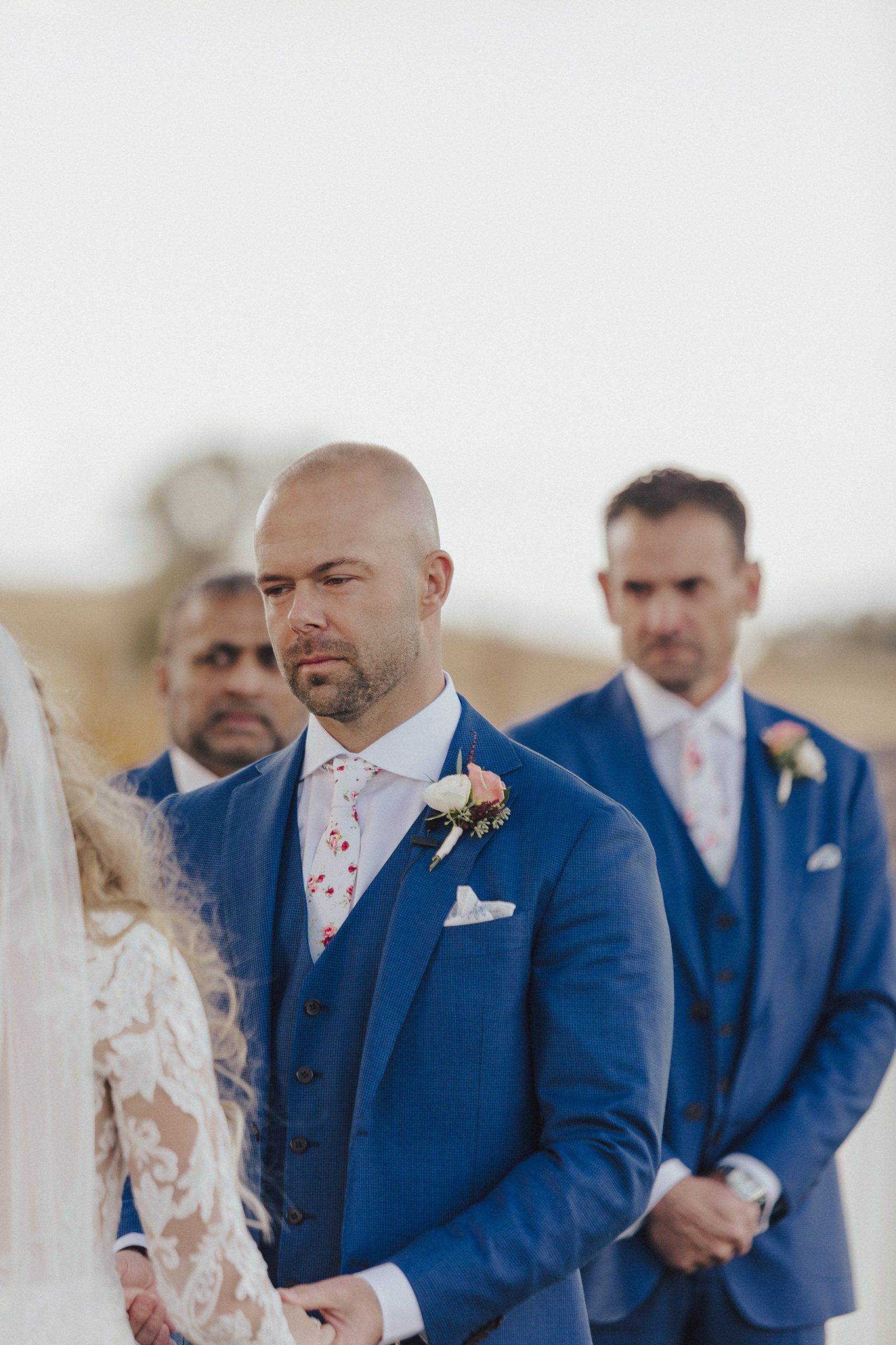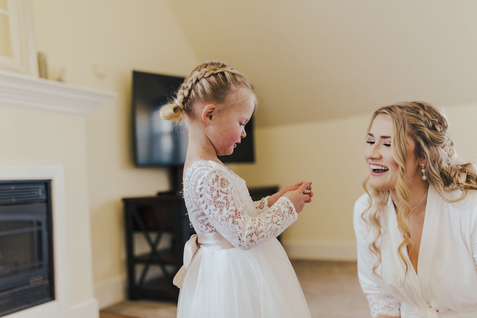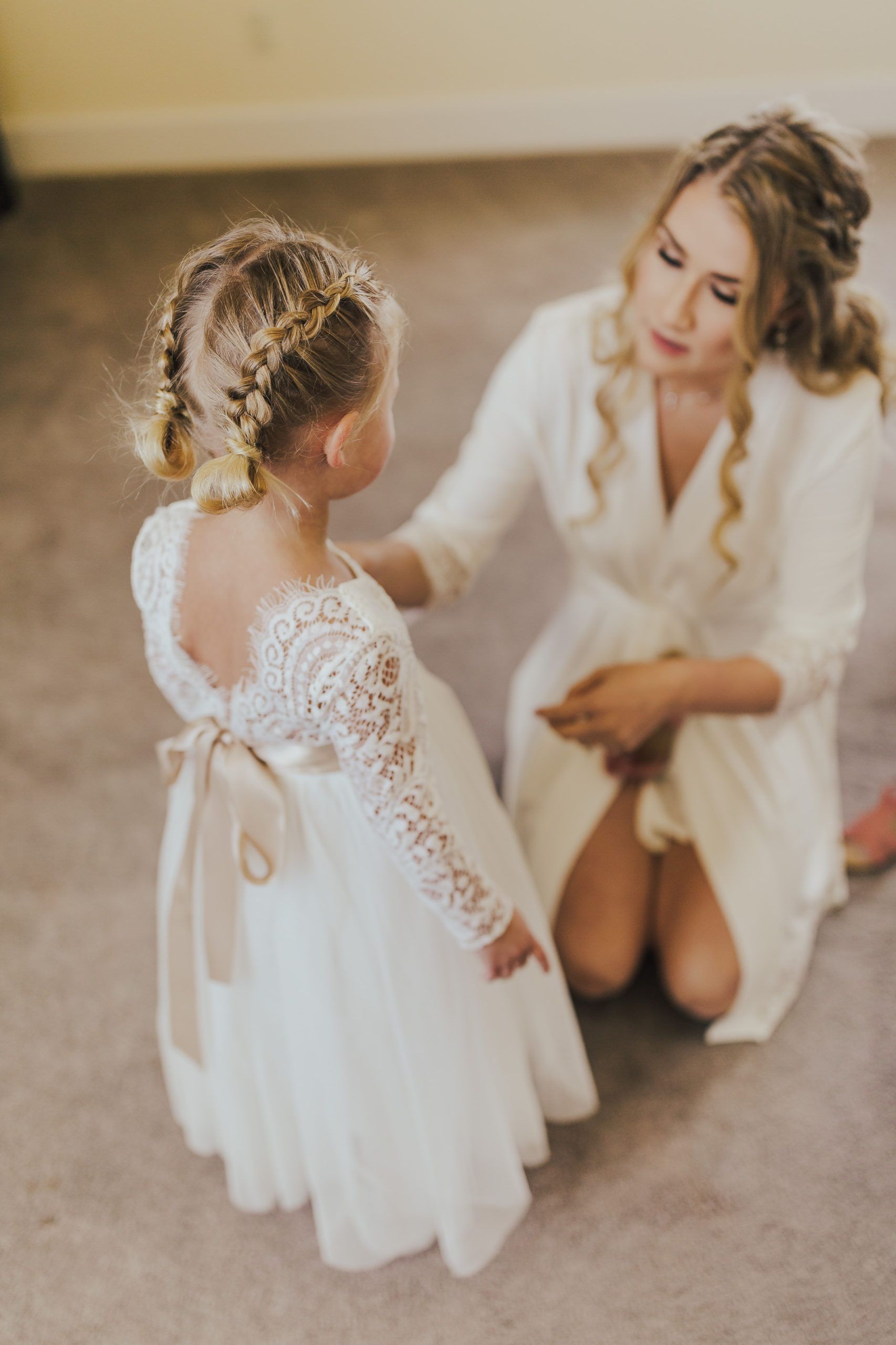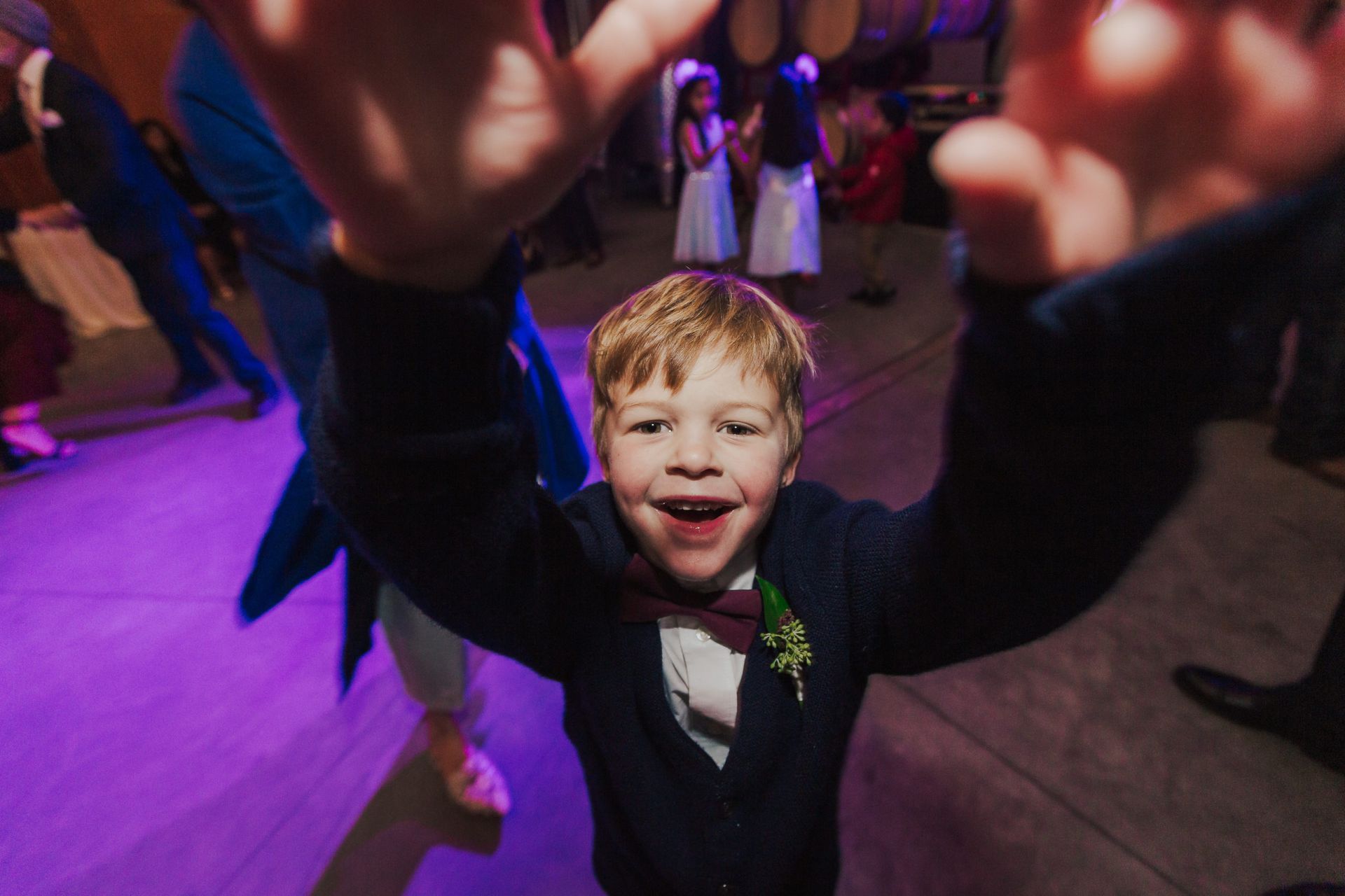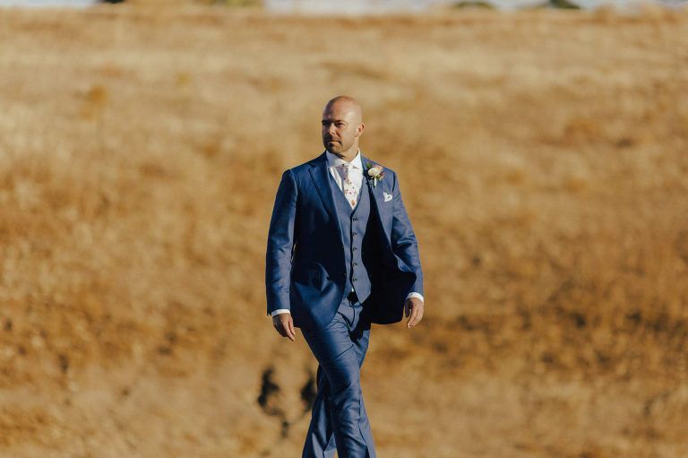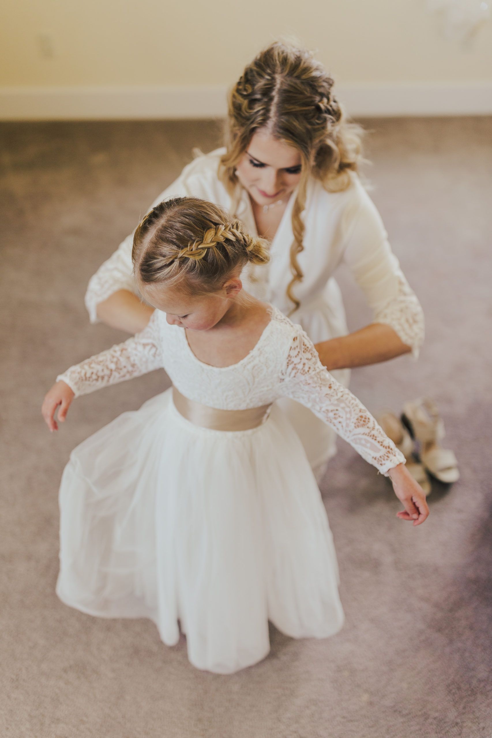 Aaron and Katelyn’s family-filled November nuptials were nothing short of incredible! Their wedding featured a ruby red and navy blue color scheme with a mix of classic and rustic elements. Their ceremony took place under the oak tree, in front of a rustic wooden hexagon arch and included a special family ritual. Katelyn’s bridal look was made complete with a long sleeve lace gown from Something Bridal Boutique , floor length veil, and faux fur coat. Her hair and make-up by The Blushed Company completed the look by styling her long blonde hair with loose curls and pinned it half up with wispy braids. Her flower girl’s dress matched perfectly, who was also in a long sleeve lace gown which was cinched with a cream satin bow and paired with her braided hair. Their special day was filled with sweet, tender moments captured by Lindsey Gomes Photography and Fig Leaf Video .