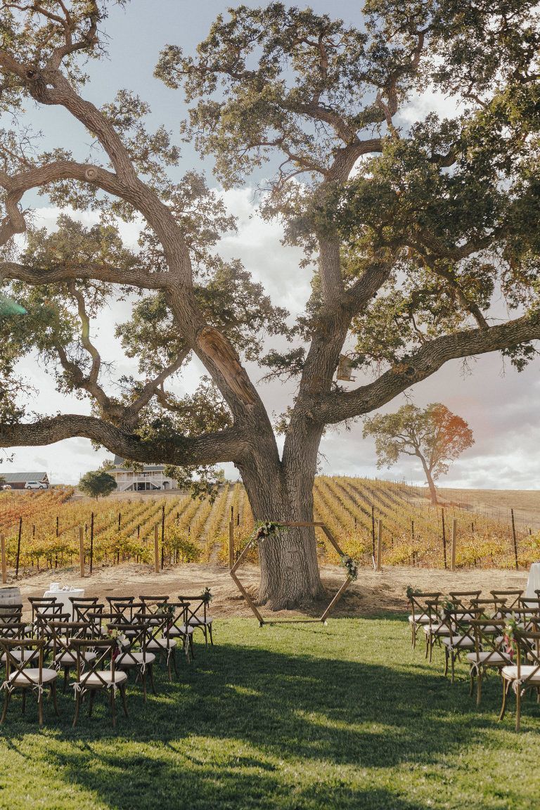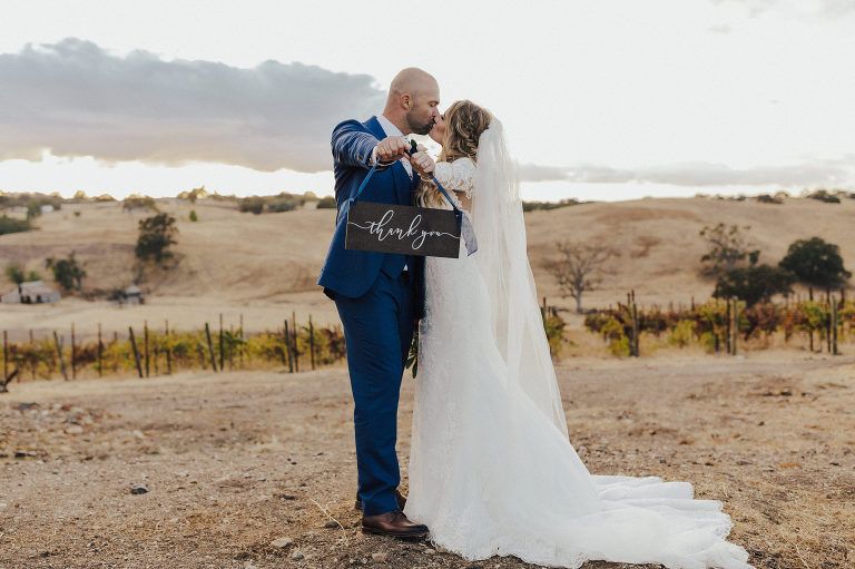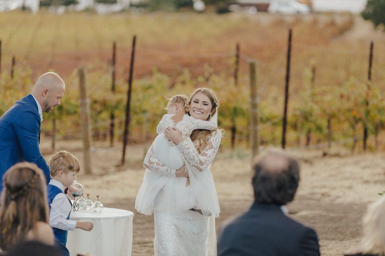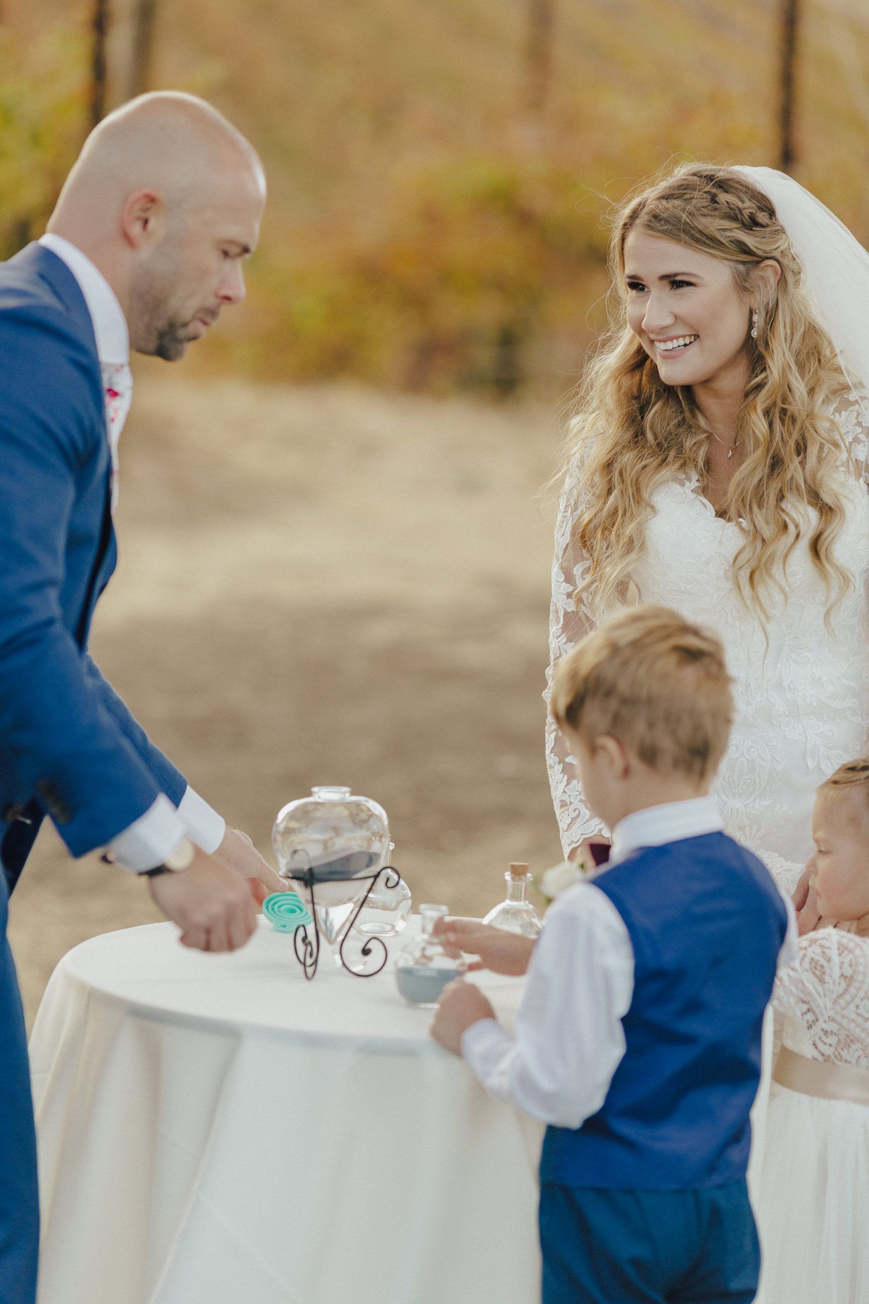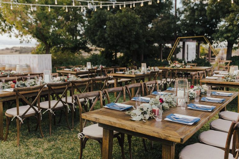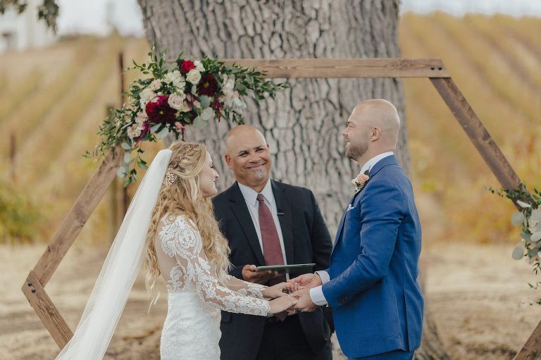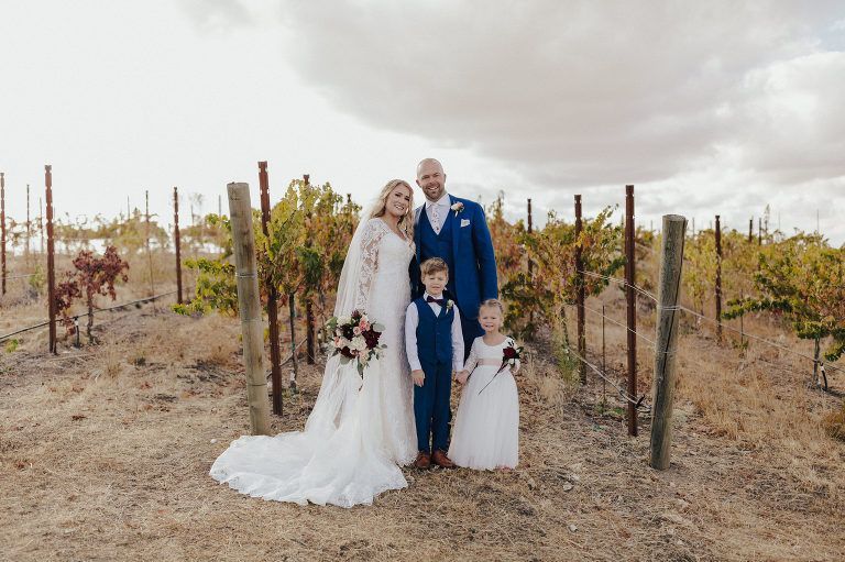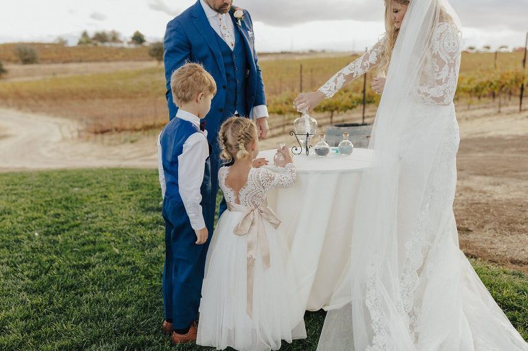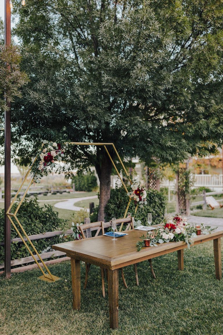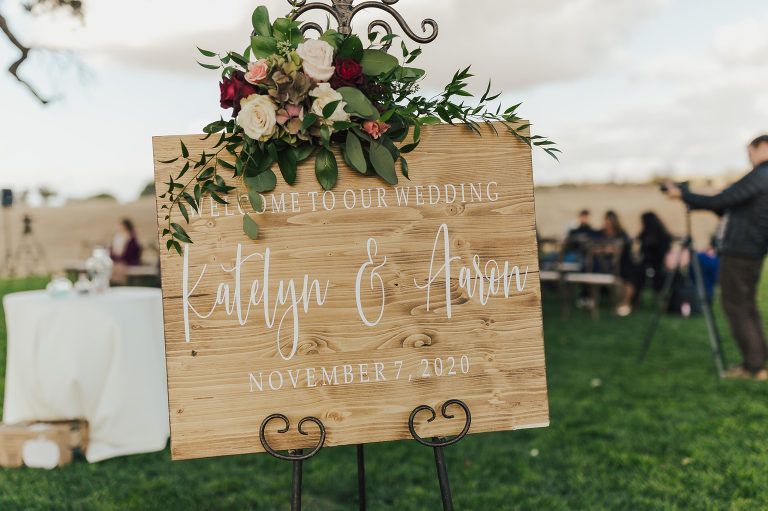 Aaron and Katelyn’s ceremony took place under the oak tree and featured a rustic hexagon arch with red floral accents. Their guests were greeted with a wooden welcome sign and live music. Their special day was family affair as they invited their two kids to join them for a unity sand ceremony. Scroll down to see this precious moment!