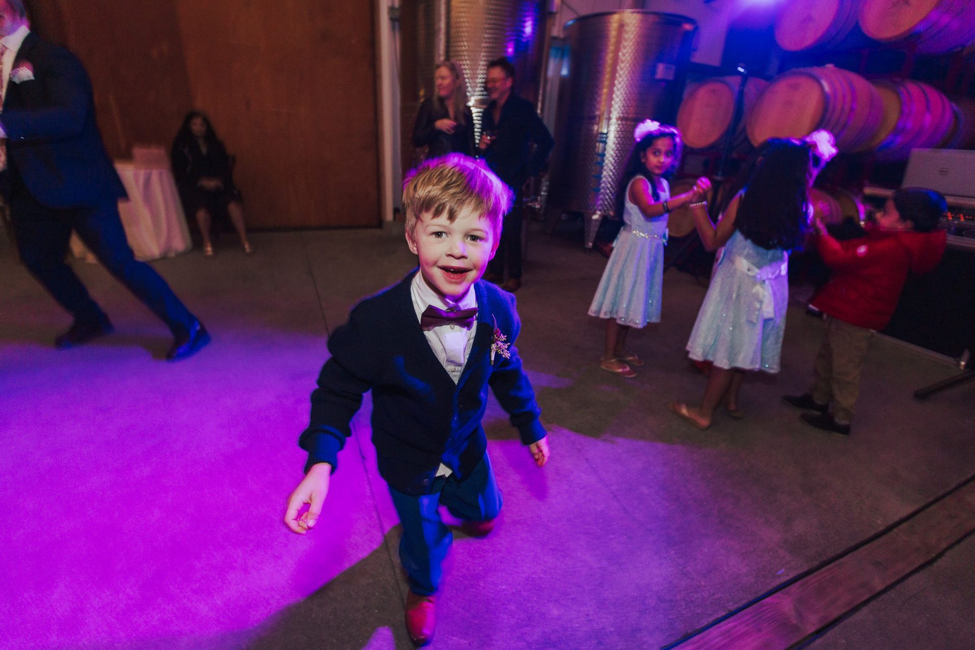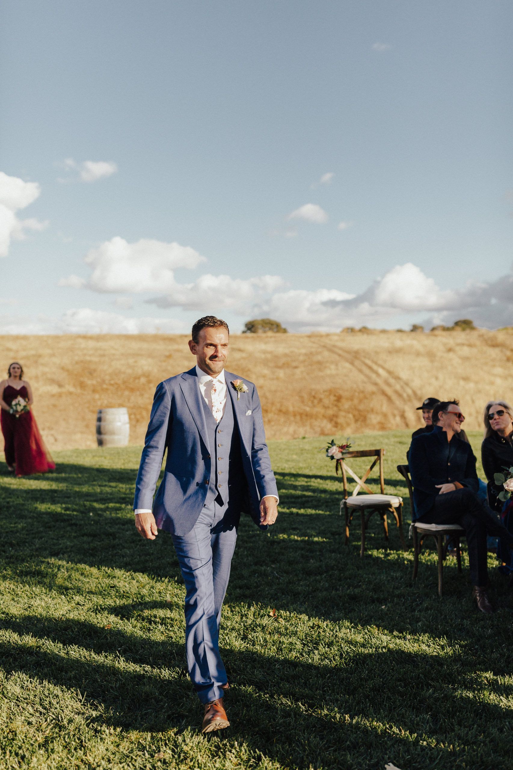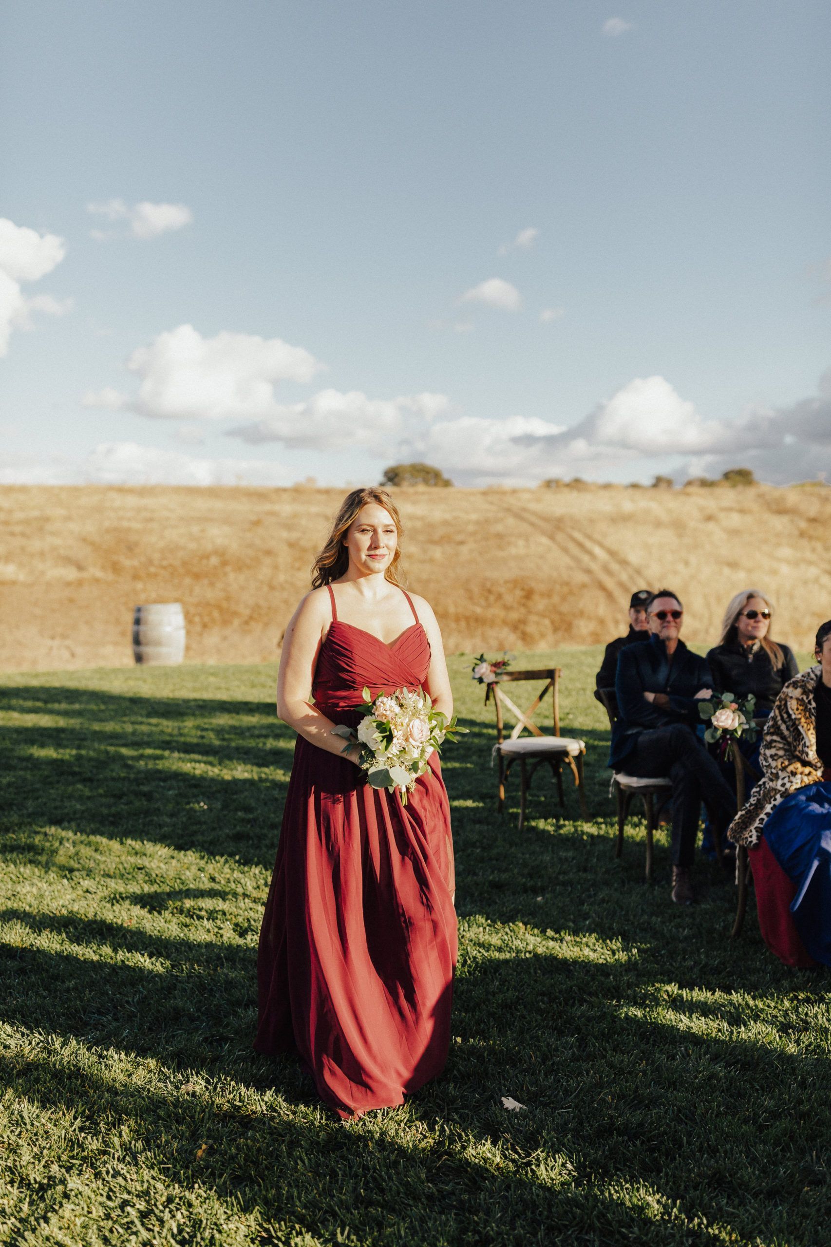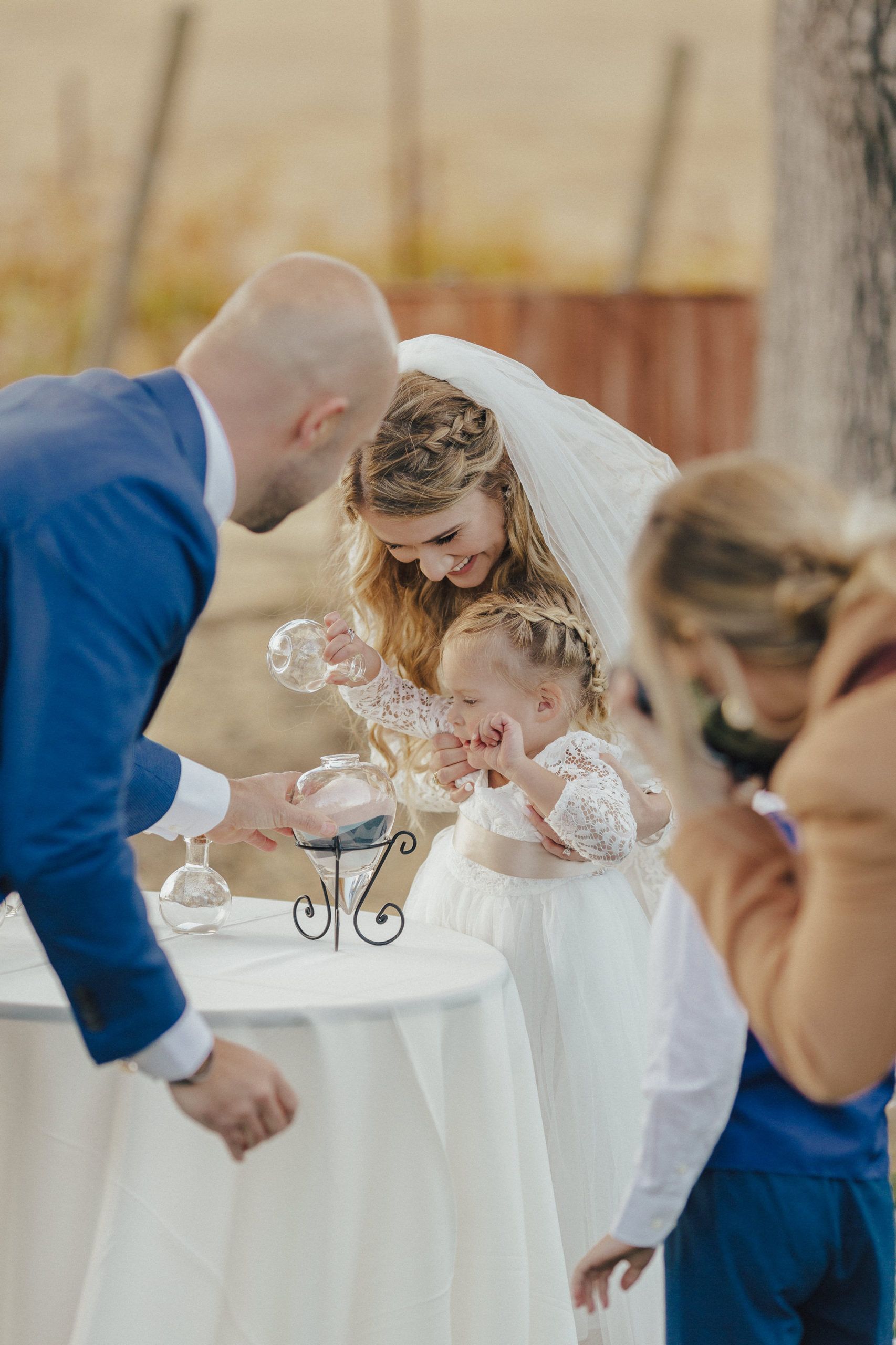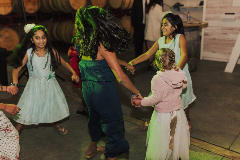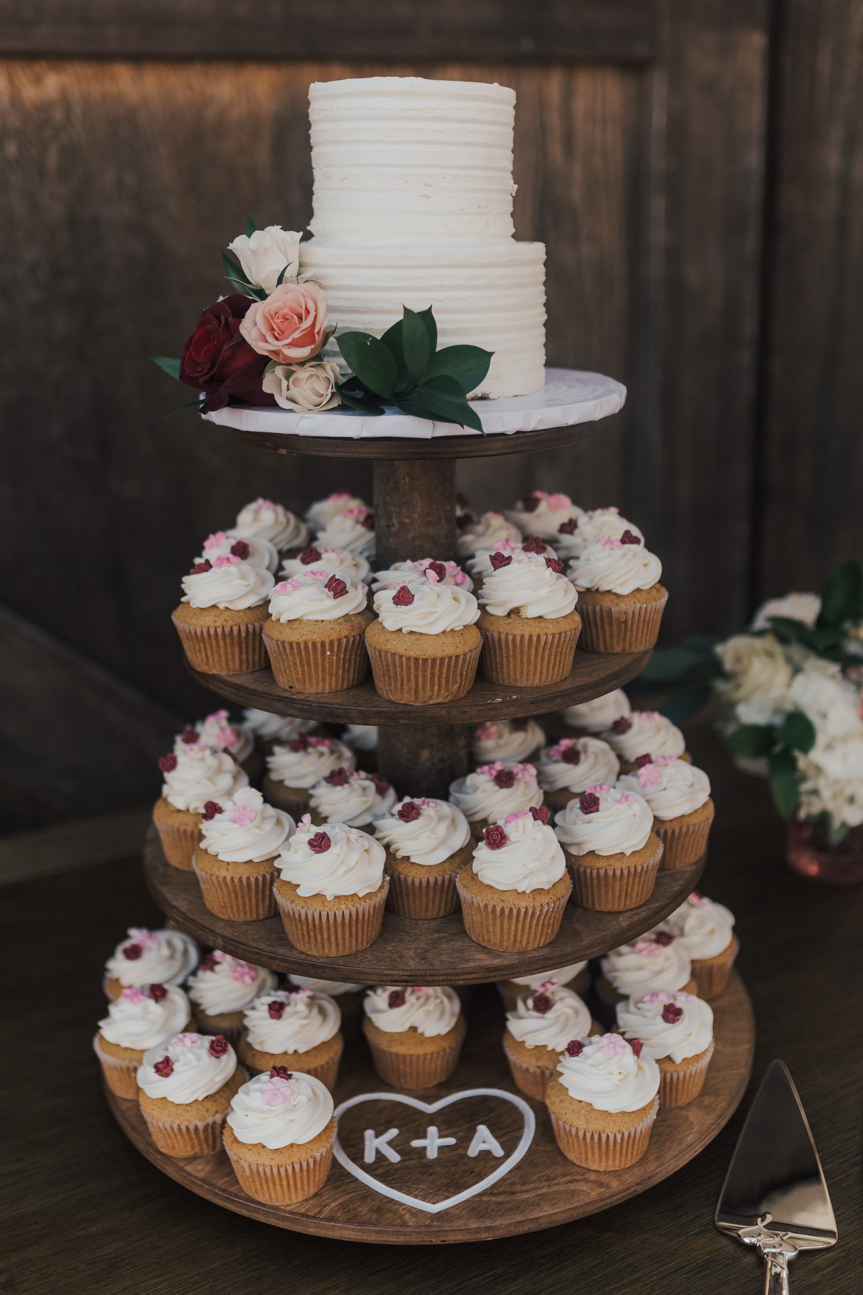 Aaron and Katelyn’s ceremony took place under the oak tree and featured a rustic hexagon arch with red floral accents. Their guests were greeted with a wooden welcome sign and live music. Their special day was family affair as they invited their two kids to join them for a unity sand ceremony. Scroll down to see this precious moment!