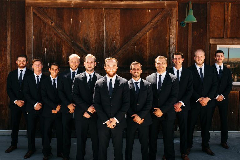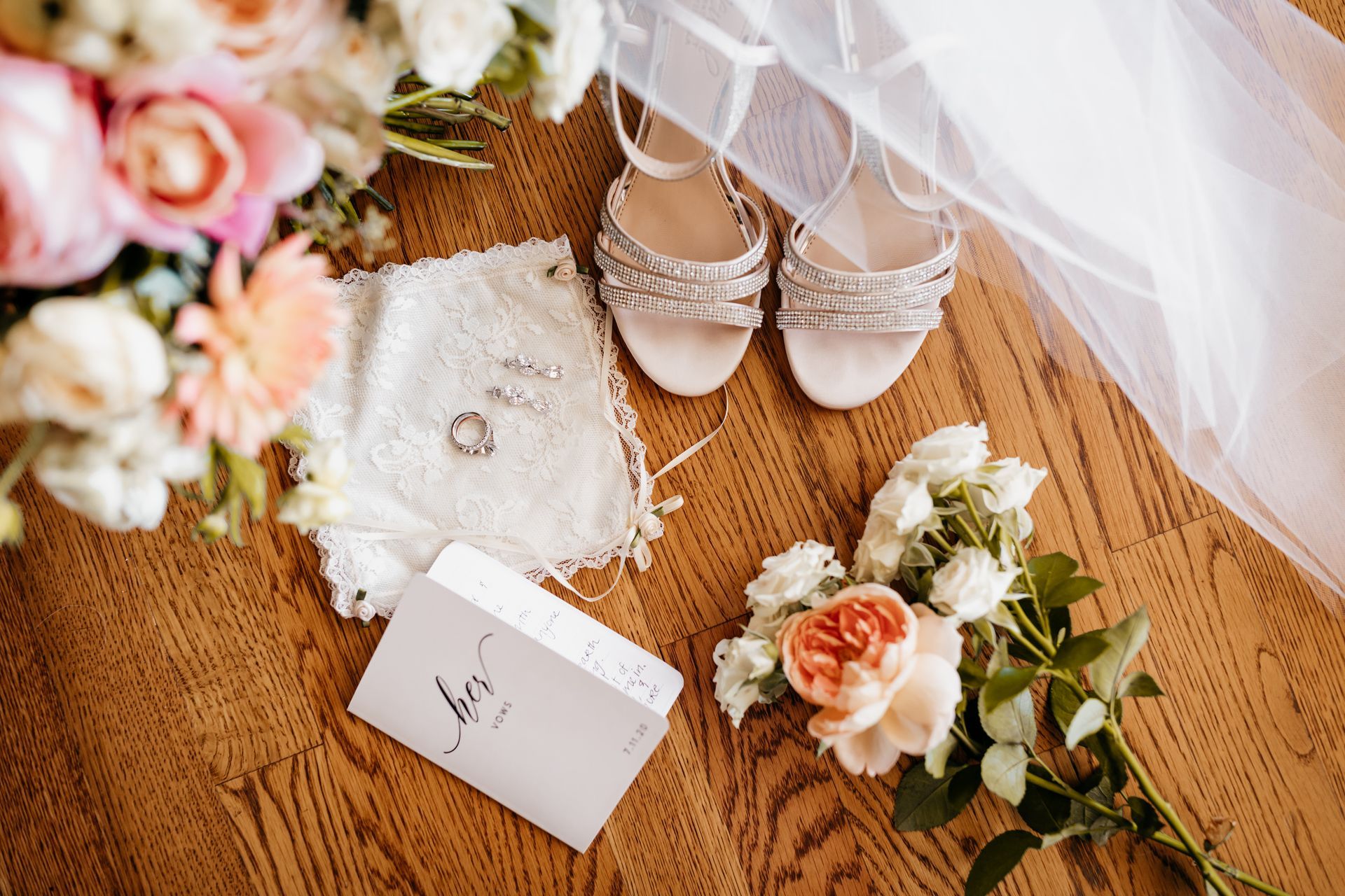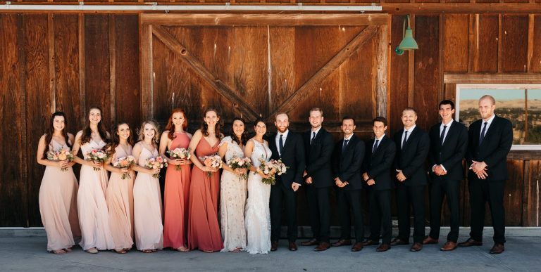 The wedding party looked lovely. The groomsmen wore matching suits, while the bridesmaids wore varying shades of light pink that all tied into the beautiful florals.